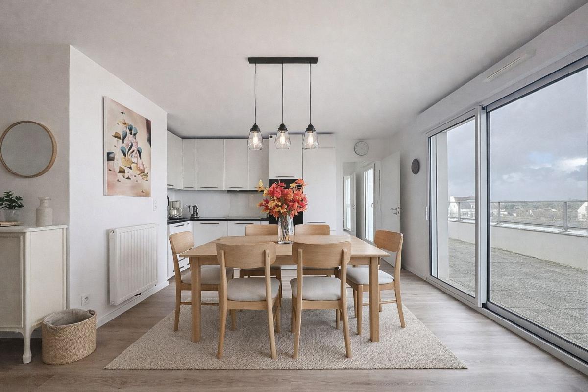 LORIENT - À deux pas du centre-ville de Lorient, cet appartement en dernier étage séduit par sa terrasse spectaculaire de 50 m², entièrement dégagée et sans vis-à-vis, véritable prolongement des pièces de vie.