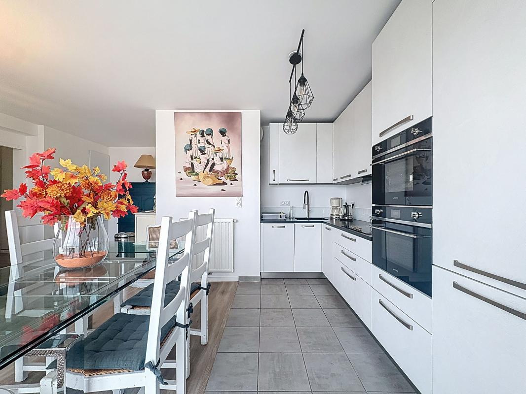 L'entrée dessert un vaste espace salon-séjour, baigné de lumière, avec cuisine ouverte aménagée et équipée, l'ensemble s'ouvrant naturellement sur l'extérieur. Une configuration idéale pour recevoir, vivre dedans/dehors et profiter pleinement des beaux jours.