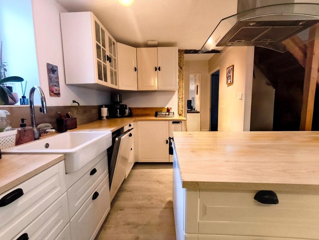 Agréable maison de 110 m² composée d'une entrée donnant sur un salon salle à manger avec un insert bois ouvert sur la cuisine avec son îlot, moderne et spacieuse, une chambre, une salle de bains, un wc.