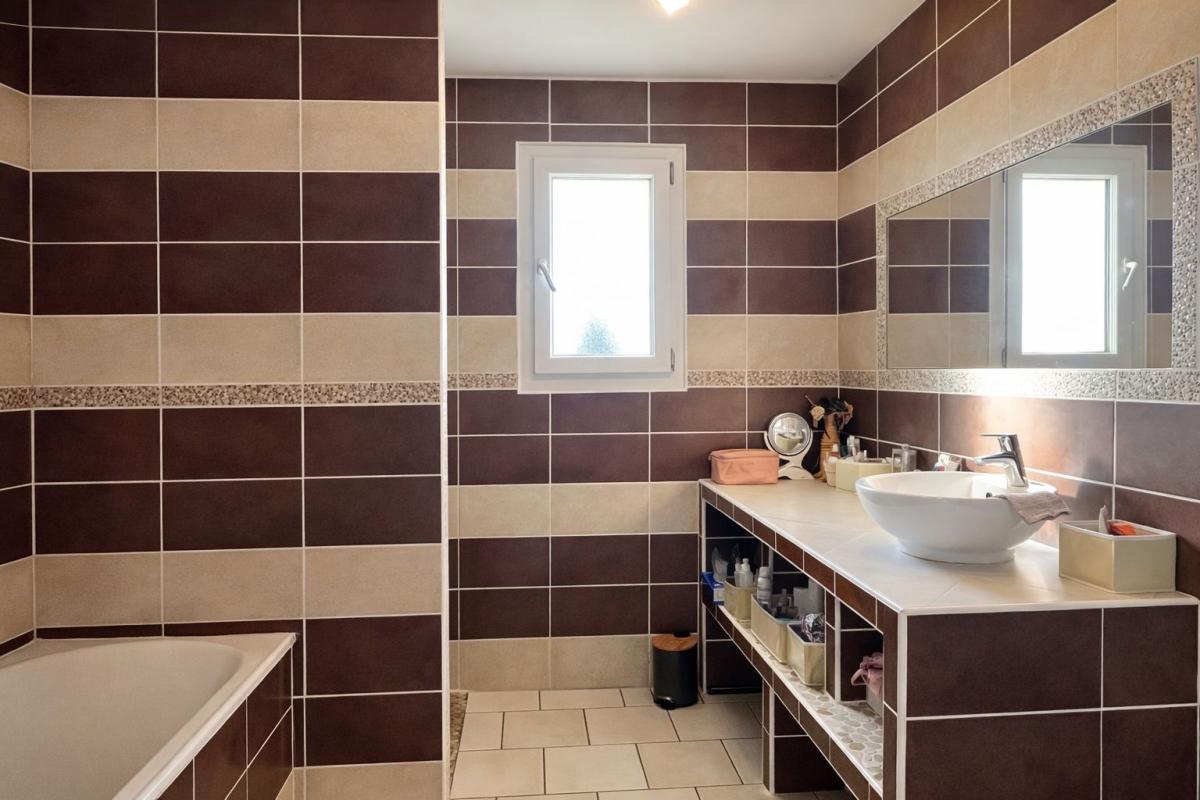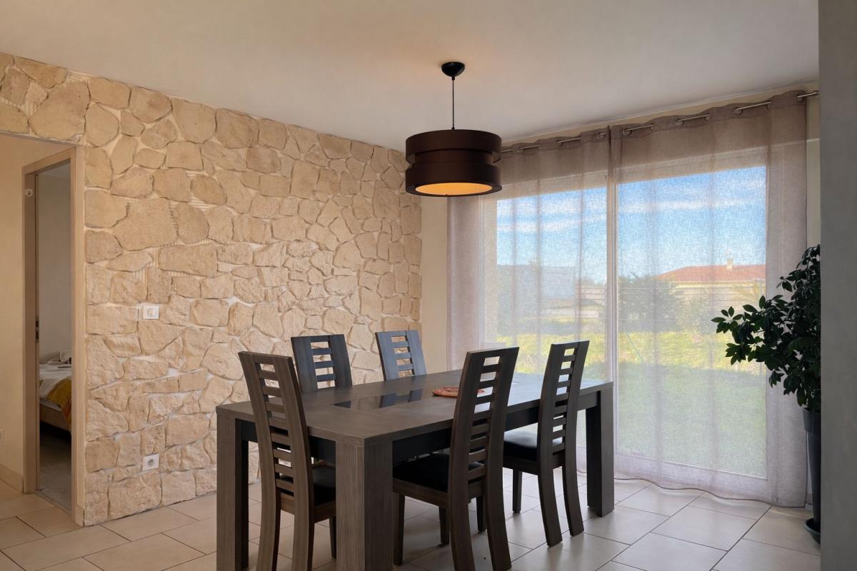 Elle se compose d'un séjour / salle à manger lumineux, d'une cuisine semi-ouverte aménagée et équipée, de quatre chambres, ainsi que d'une salle de bains avec douche et baignoire. Un cellier complète l'espace intérieur.