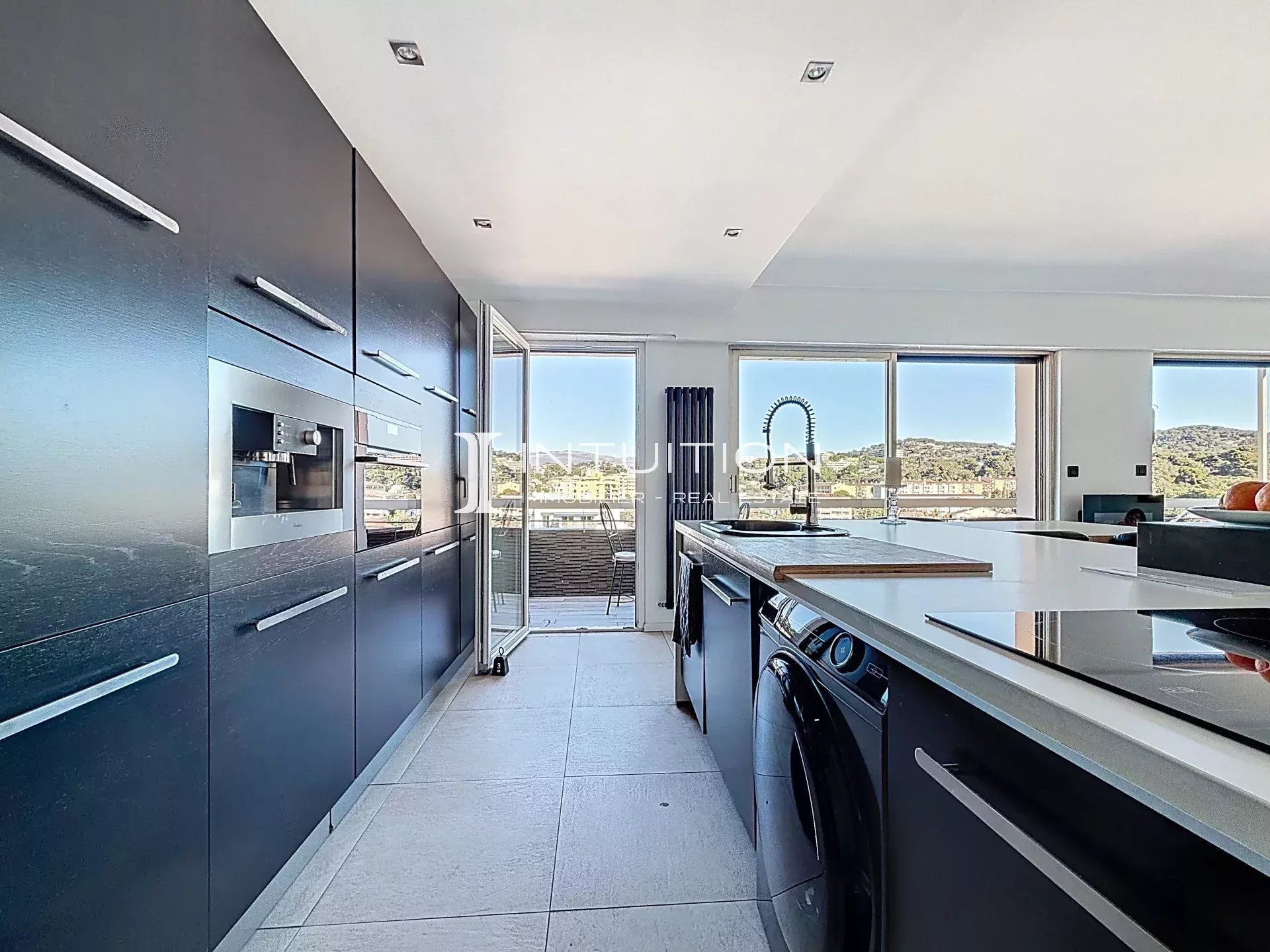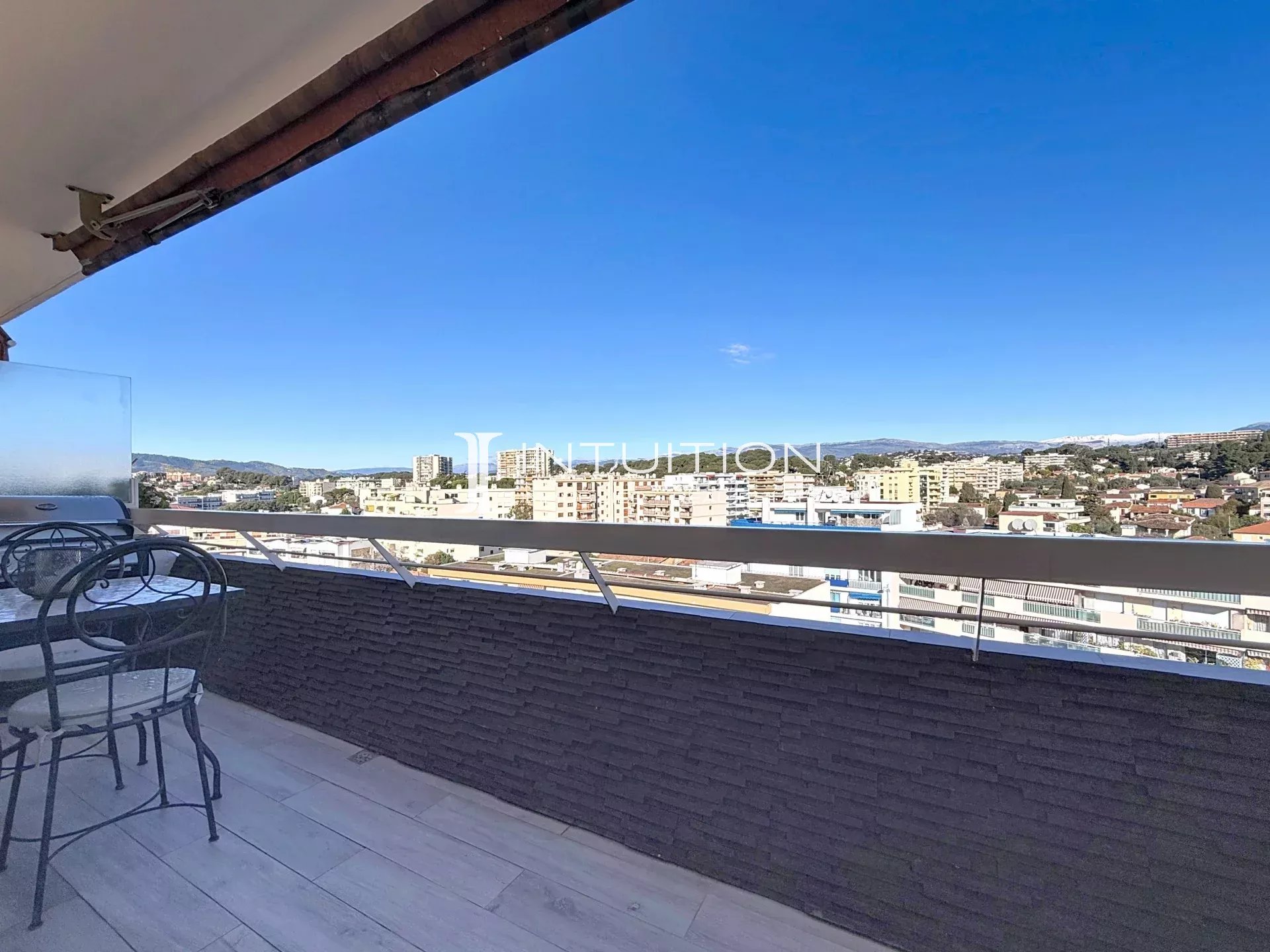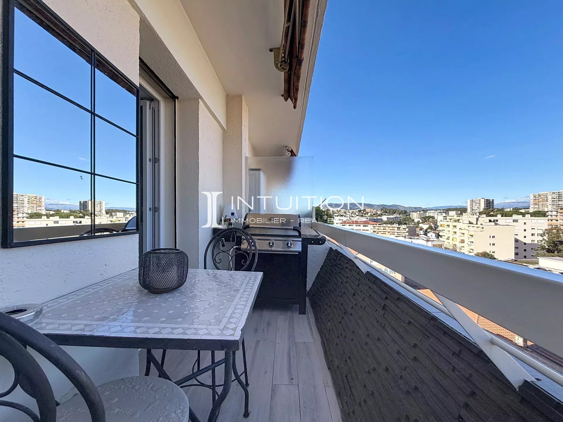 Il se compose d'une entrée, un vaste séjour avec cuisine entièrement équipée donnant sur une grande terrasse avec vue dégagée sans vis-à-vis sur la ville et l'arrière-pays, un coin bureau, deux chambres avec terrasses, dont une avec salle de bains et baignoire incorporée, une salle de douche, un large dressing, et un W.C séparé.