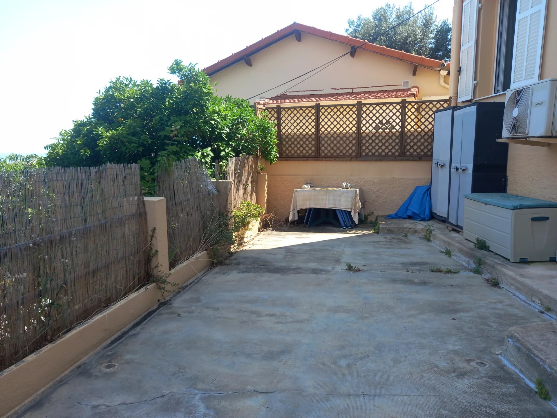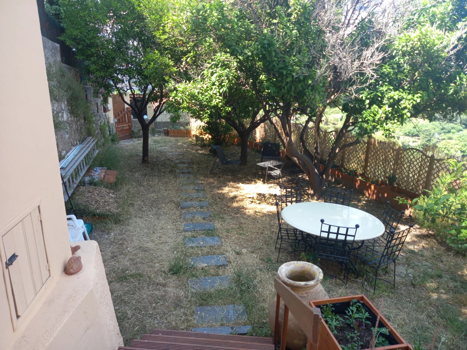 Rare : aux portes de Monaco, agréable 2 pièces avec vue mer et montagnes, beau jardin arboré de 60 m², terrasse 55 m², dans une des dernières petites copropriétés sans charges de ce quartier... Une réelle rareté.