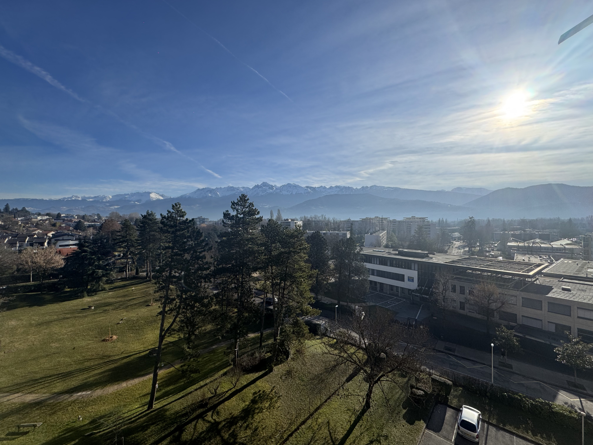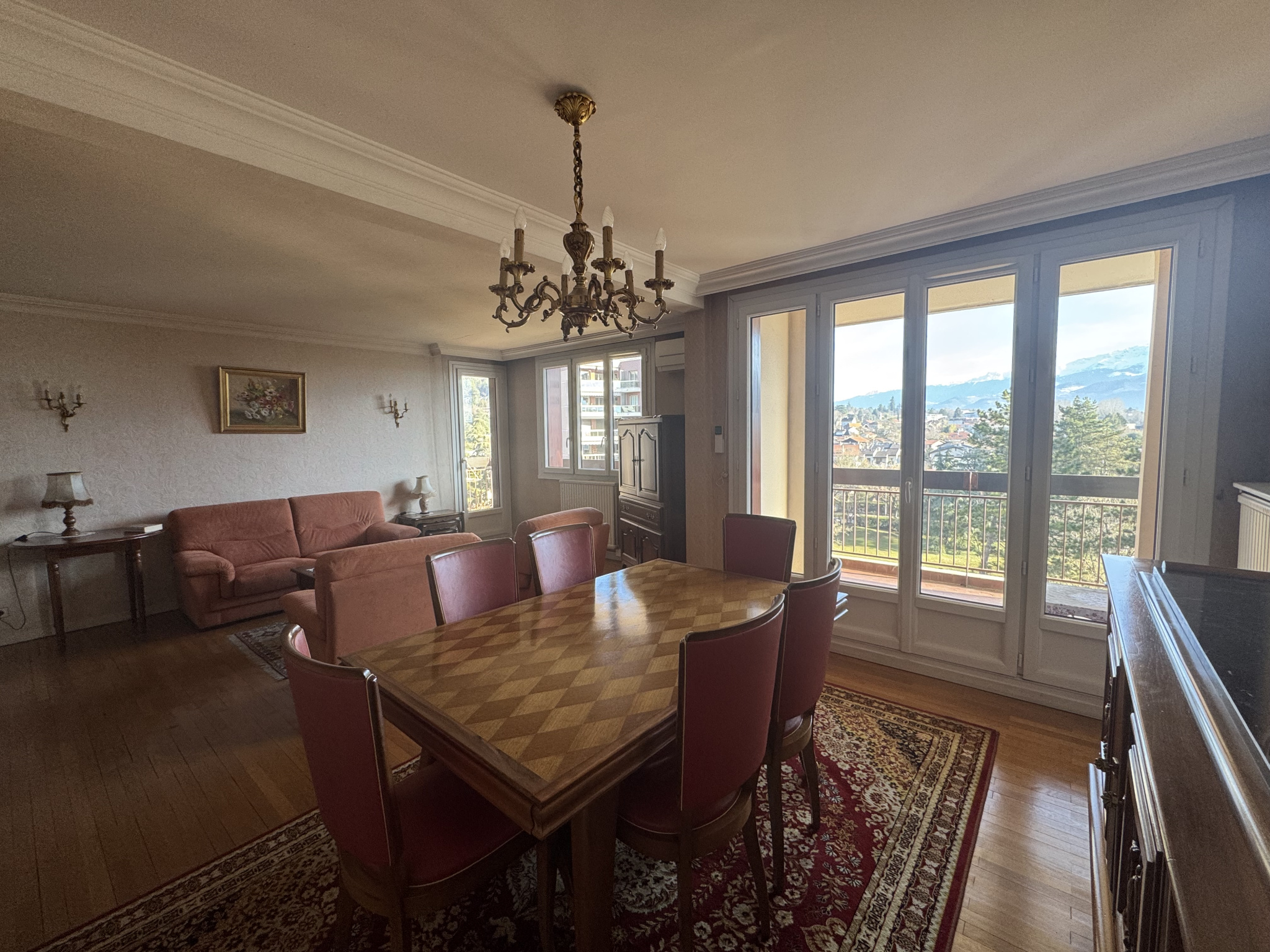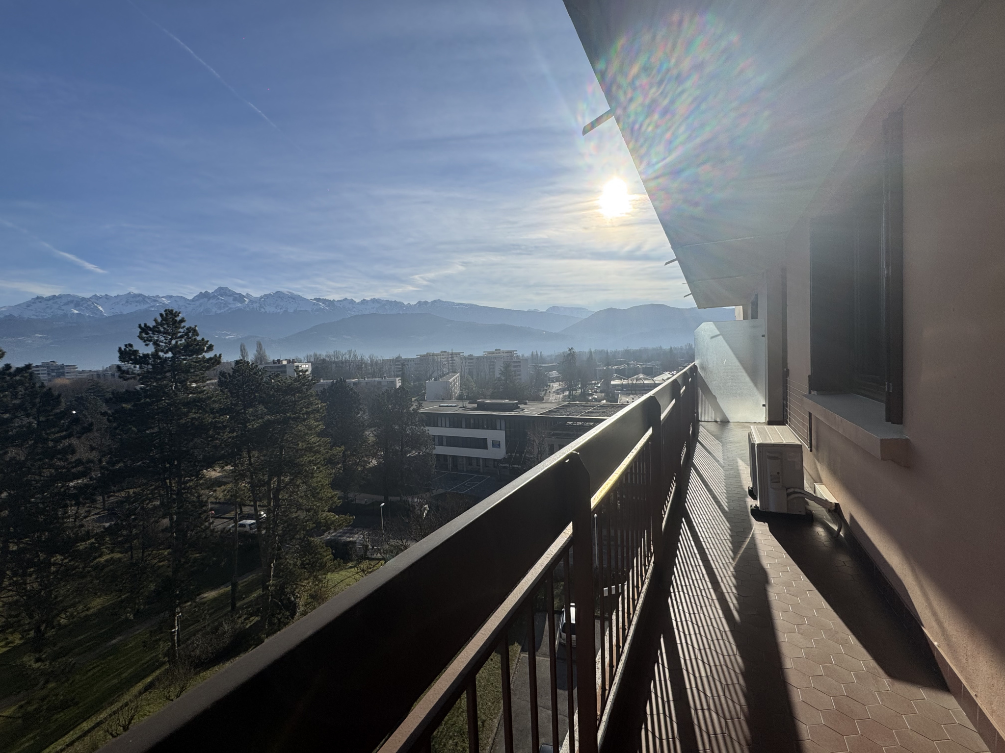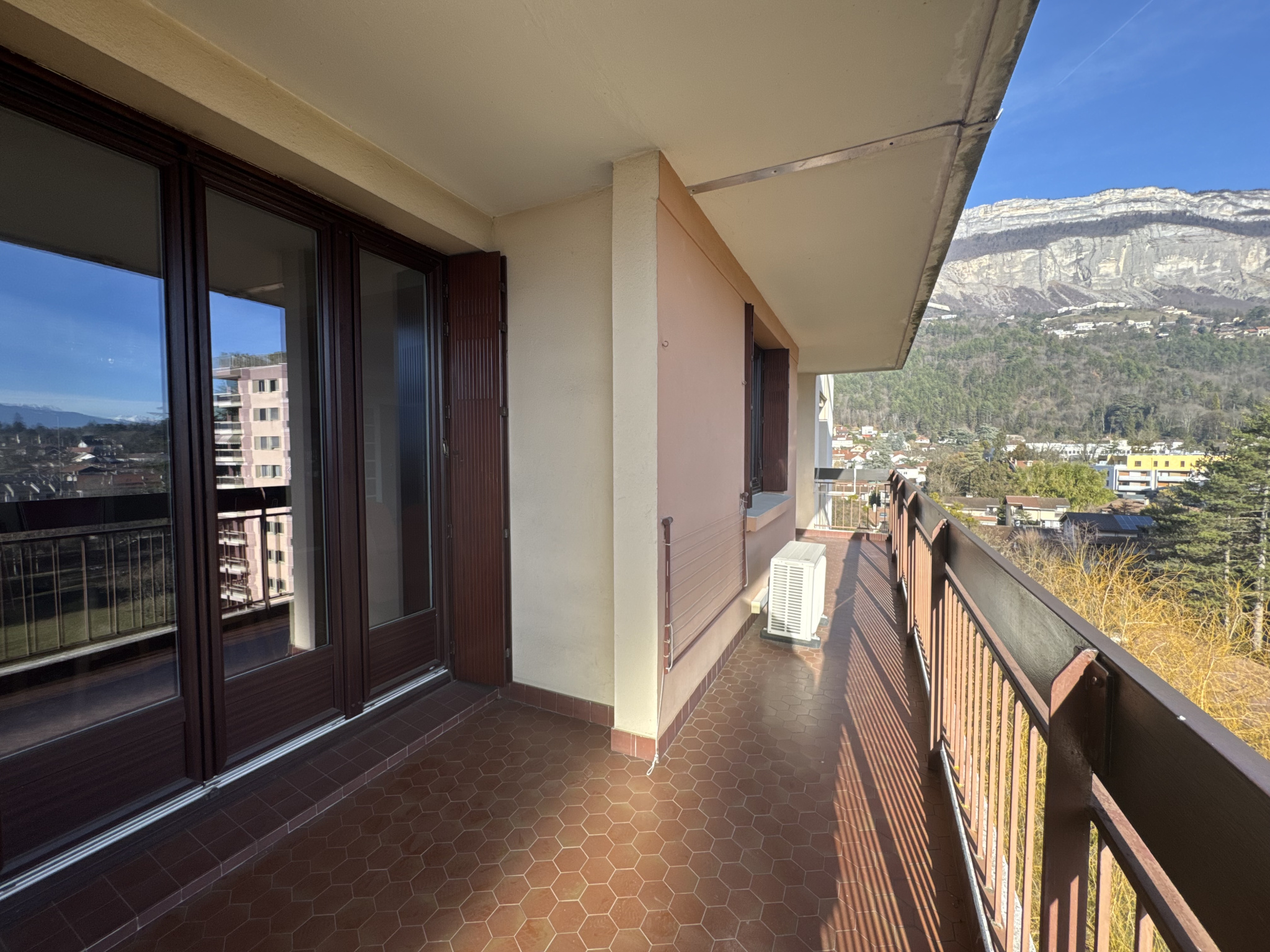 Le séjour et la cuisine sont exposés Sud Est et s'ouvrent sur un balcon + coin terrasse qui offre une très belle vue dégagée sur Belledonne. Les chambres sont exposées Nord avec vue sur la chartreuse. Cet appartement nécessite un embellissement mais est très bien entretenu.