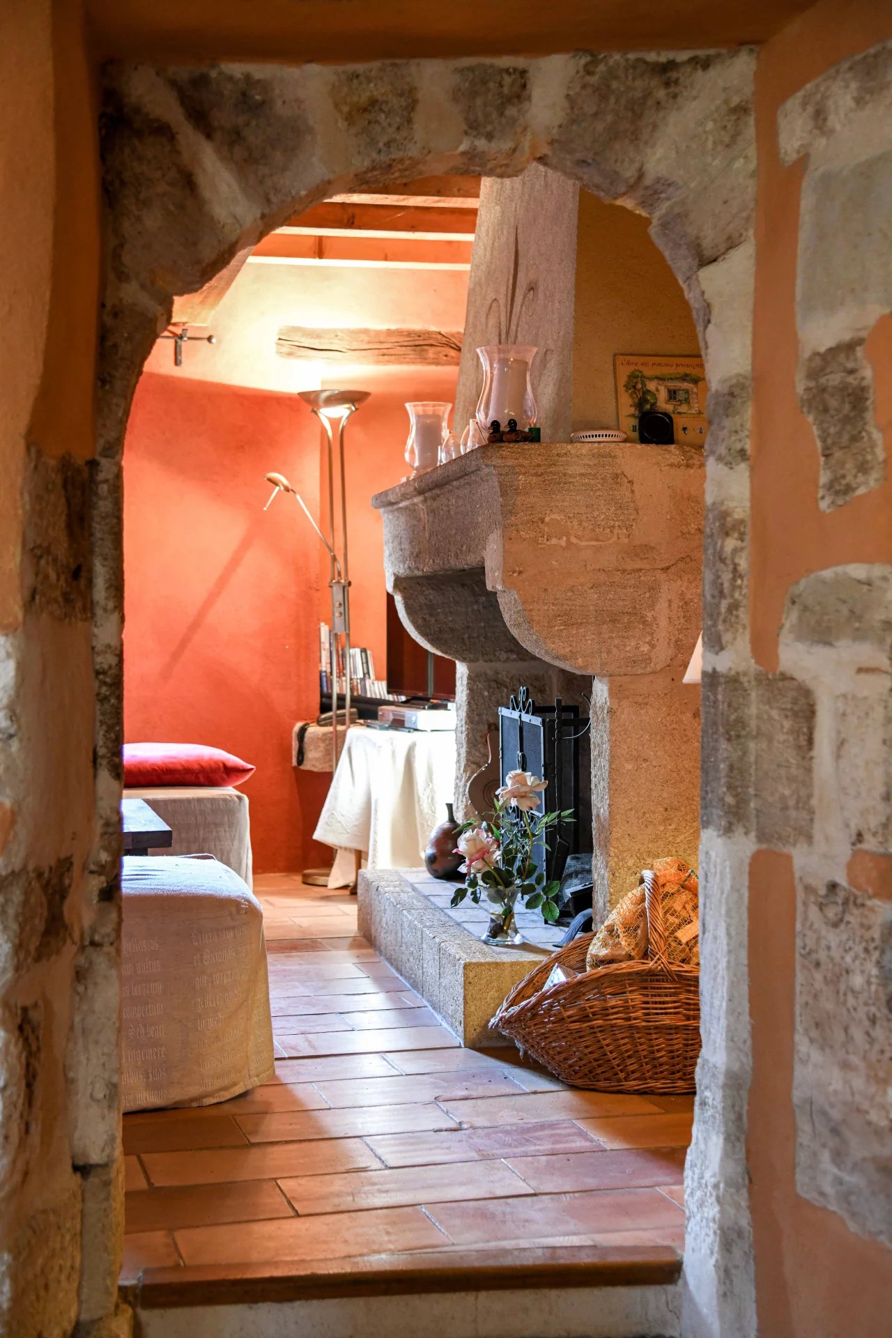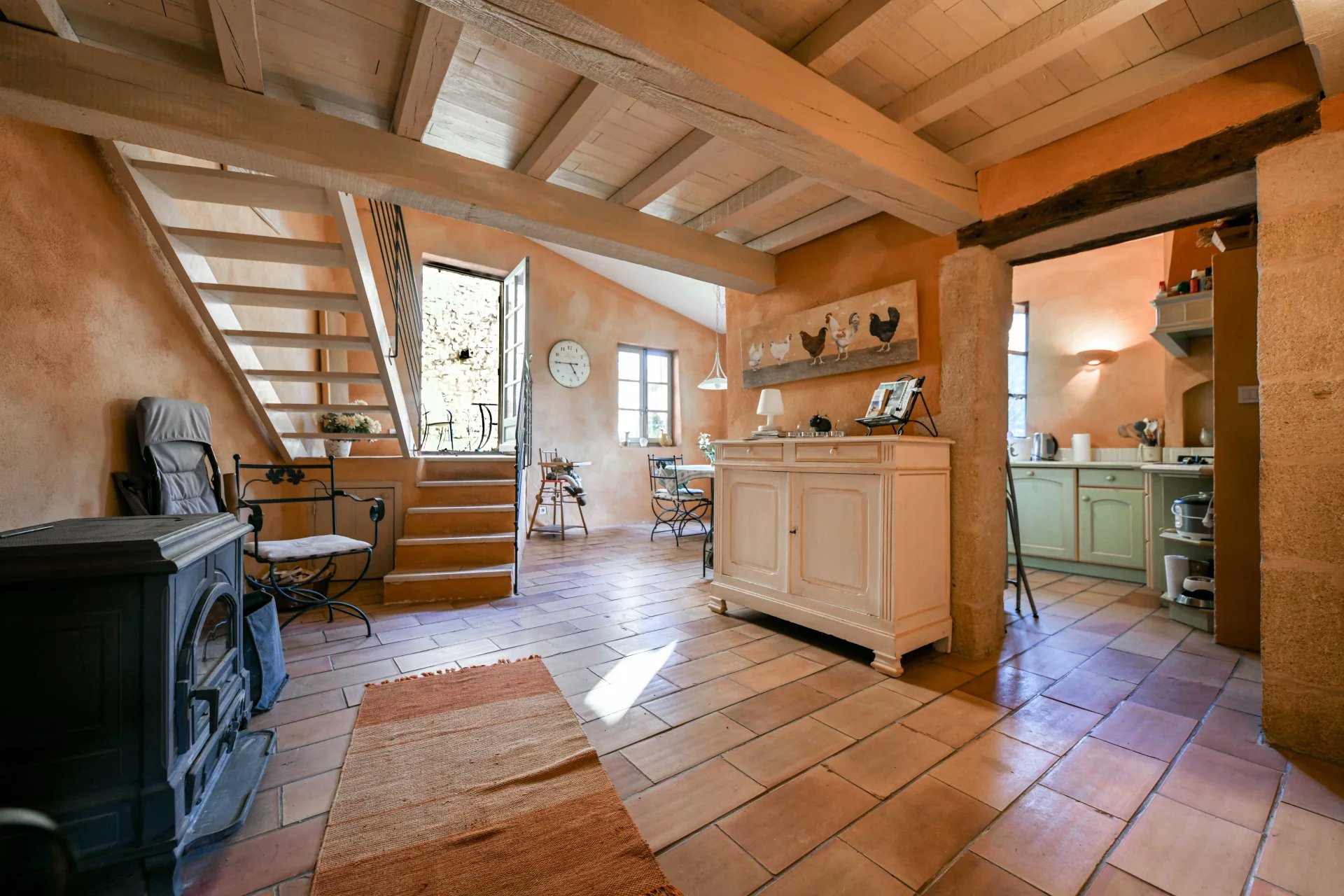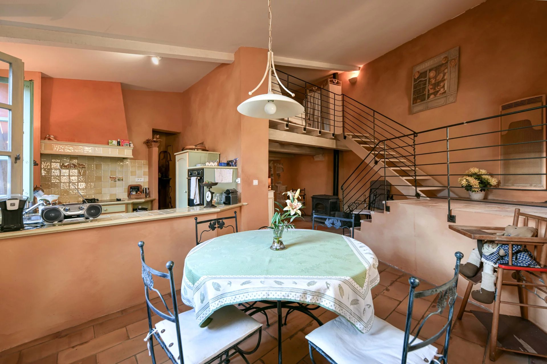 Confortable séjour prolongé par un salon avec cheminée