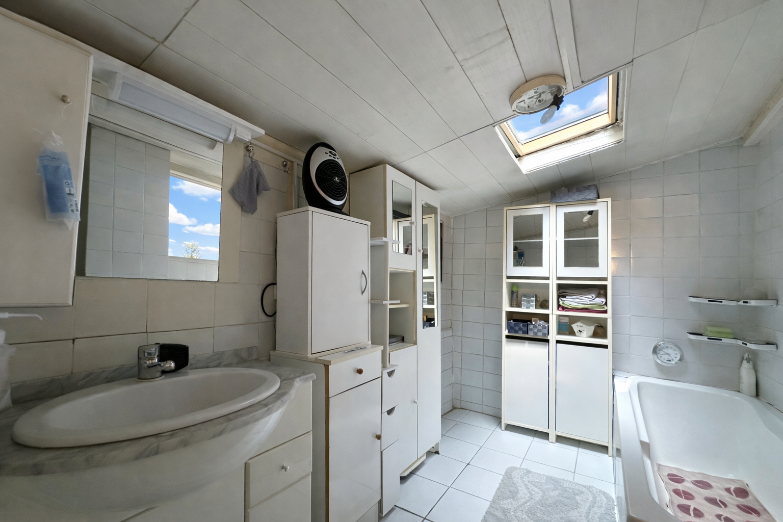 une salle de bains de 5,75 m2 (ventilation naturelle, radiateur, vélux, simple vasque),