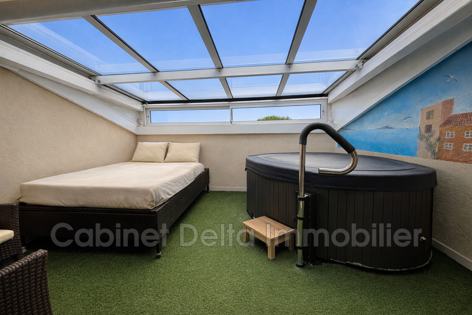 À l'étage : L'espace nuit et bien-être se poursuit avec une chambre, un bureau/dressing, une buanderie, ainsi qu'une véranda aménagée avec spa, une seconde salle d'eau et des WC.