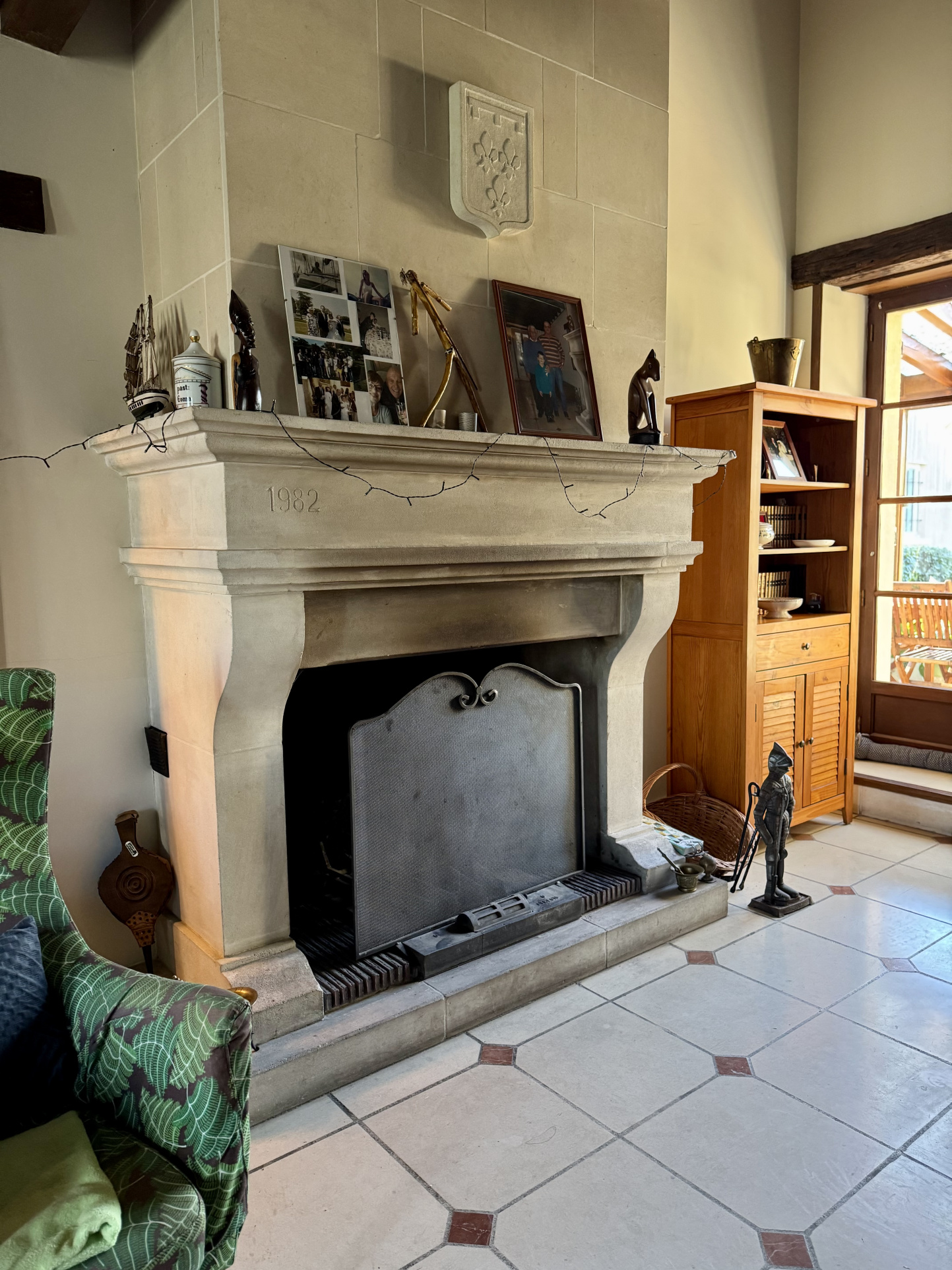 AU RDC : entrée, cuisine aménagée/équipée récemment, WC, magnifique SALON CATHÉDRALE avec cheminée en pierre de taille, salle de bain en marbre rose, chambre, laverie et lingerie avec rangements.