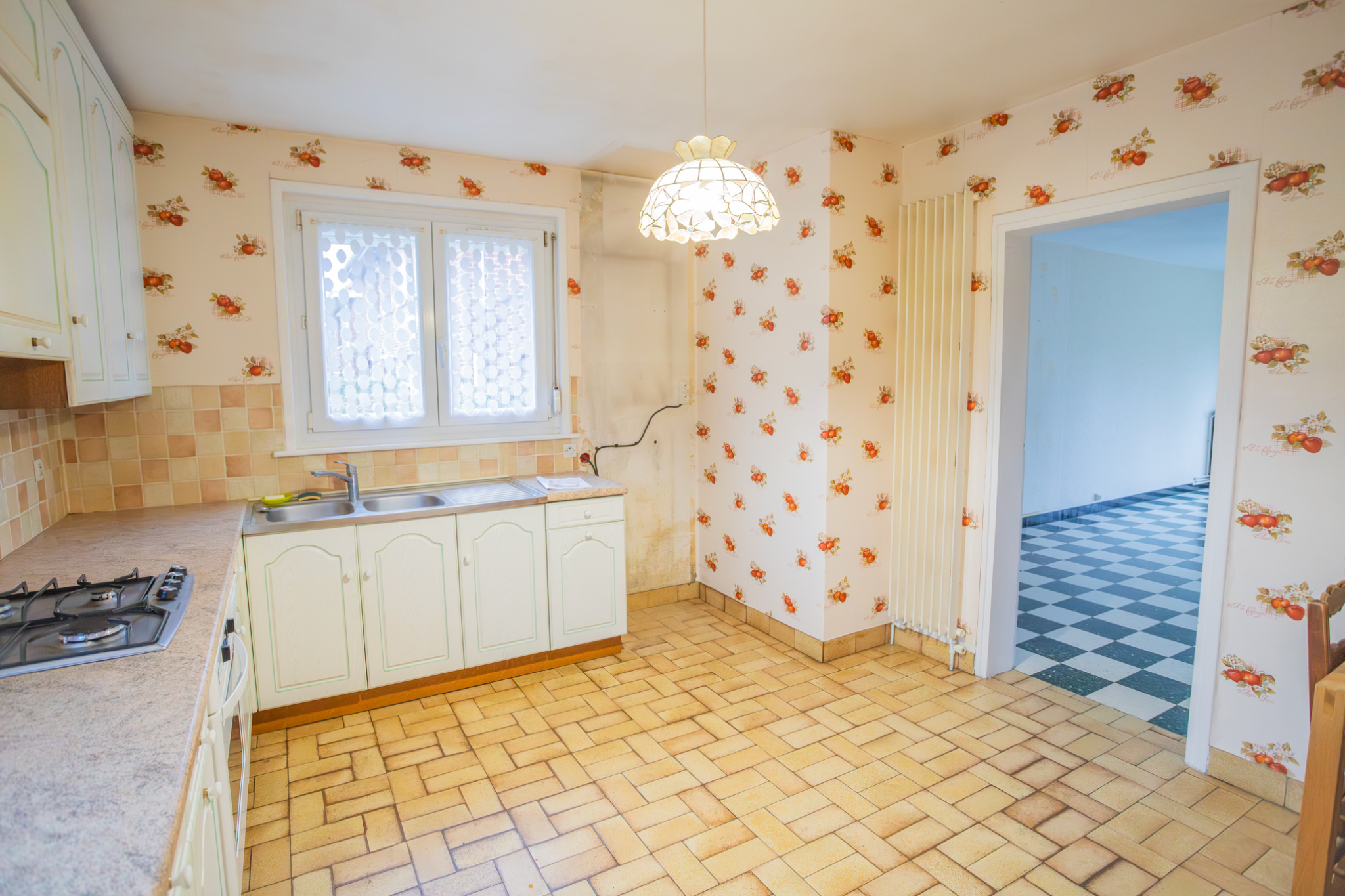 RDC :Le hall d'entrée dessert la cuisine ainsi que le salon/séjour. La cuisine, d'environ 14 m2, est située à l'avant de la maison et bénéficie d'ouvertures sur deux pans de mur, offrant un espace convivial permettant l'aménagement d'un coin repas. Le salon/séjour, en L, s'ouvre sur le jardin et permet de distinguer harmonieusement deux espaces de vie. Le sol est habillé d'un carrelage en damier noir et blanc. Les menuiseries sont en double vitrage PVC avec volets roulants électriques.