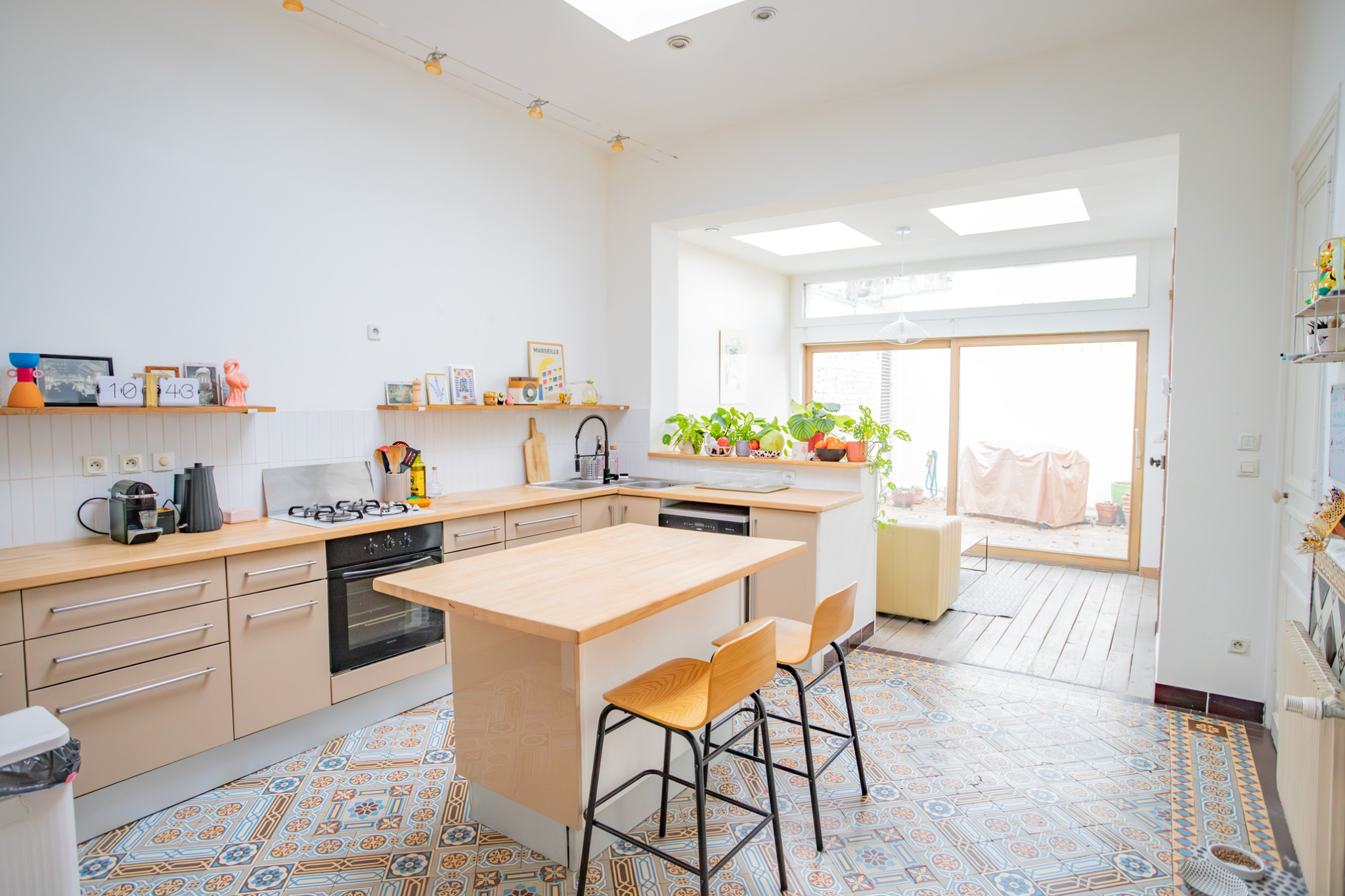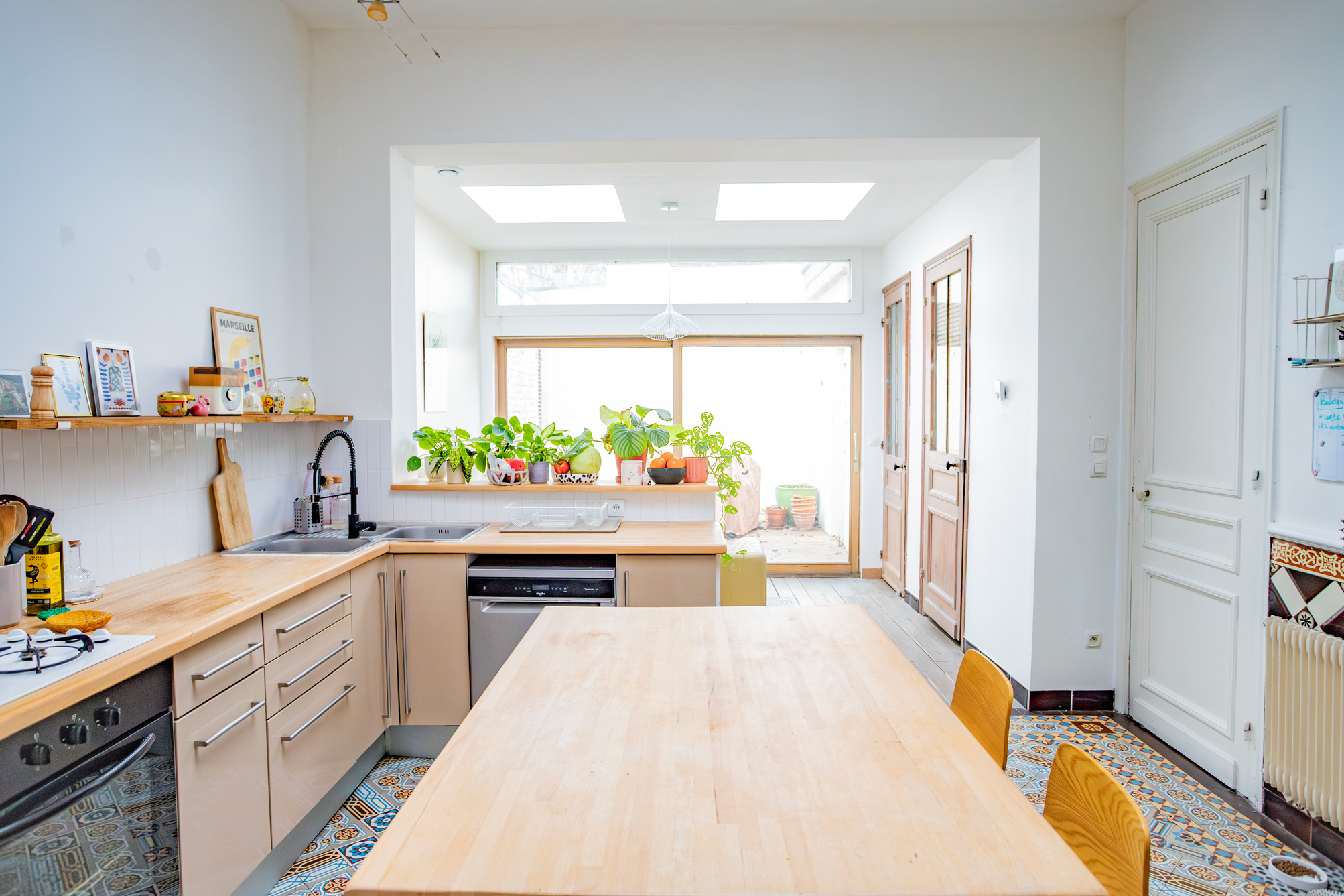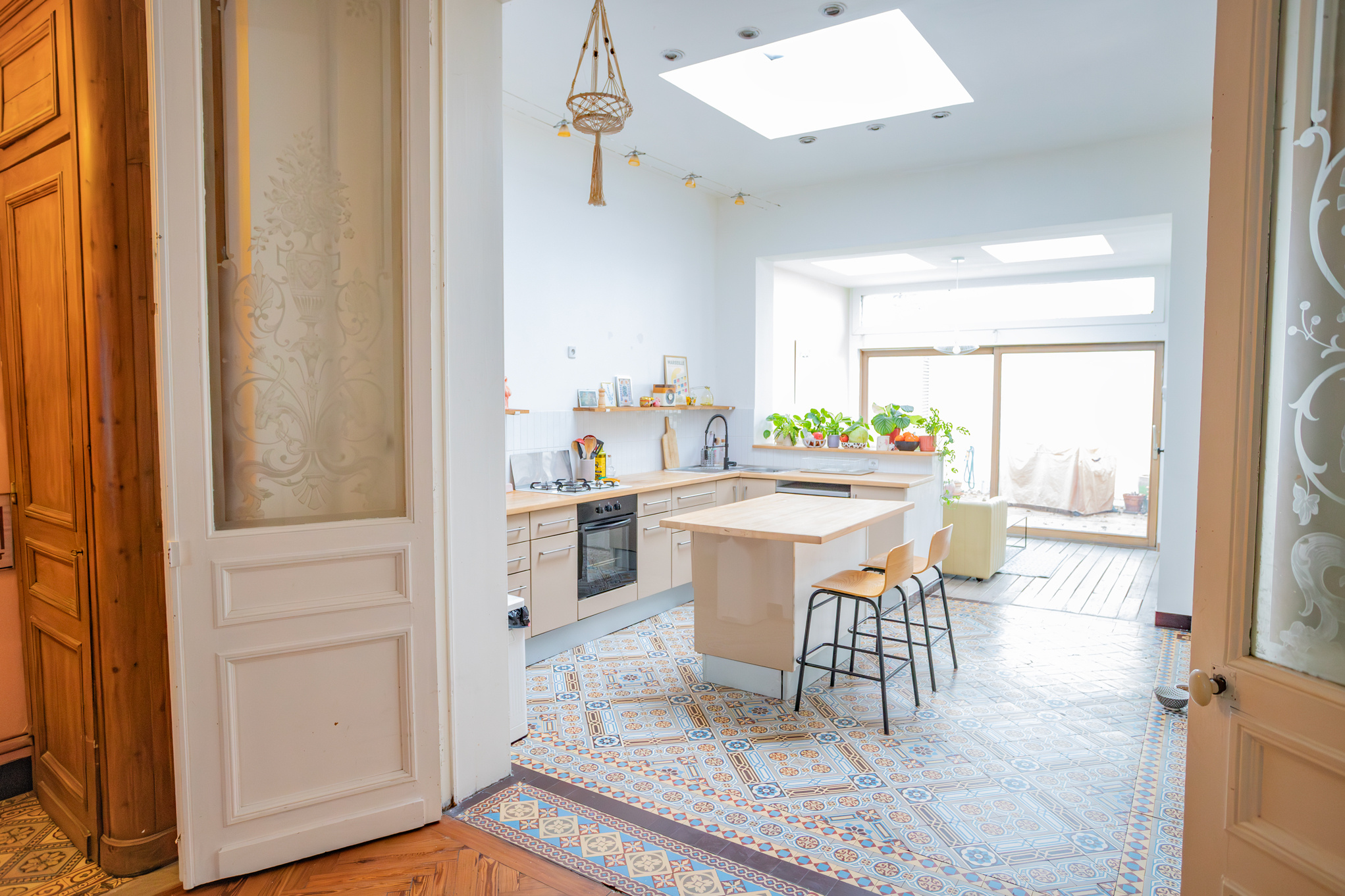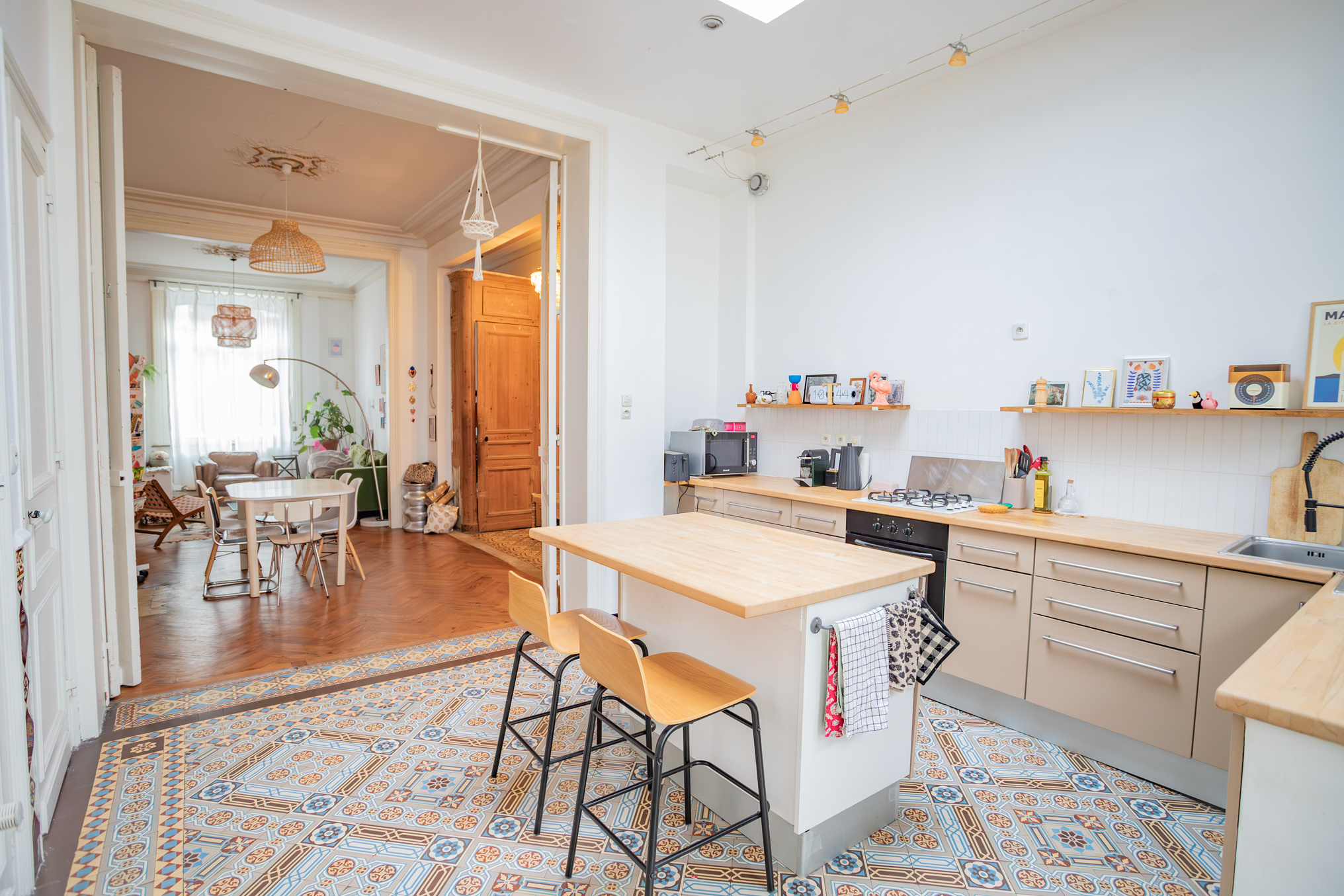 On passe du parquet aux carreaux de ciment dans la cuisine où vous pourrez vous éclater grâce à la surface de 17m2 (hors petit salon de 9,50m2).