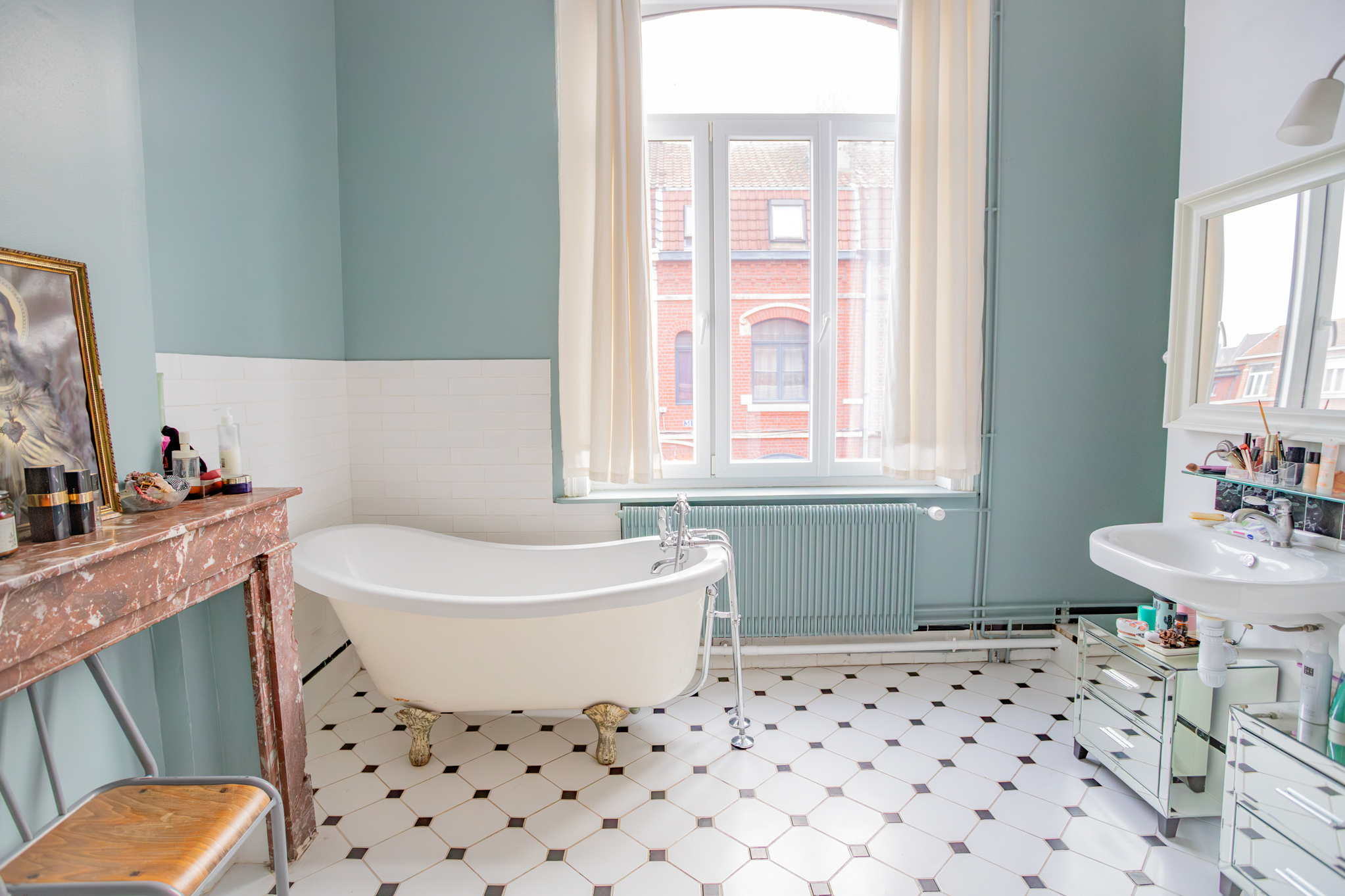 Ensuite, en façade avant, la grande salle de bain de 16m2. On y trouve une baignoire de style, une douche et vasques. Dans un renfoncement on accède au WC indépendant. Pour votre parfaite information un accès à la chambre se fait par cet espace (vous comprendrez mieux en visite ;))...