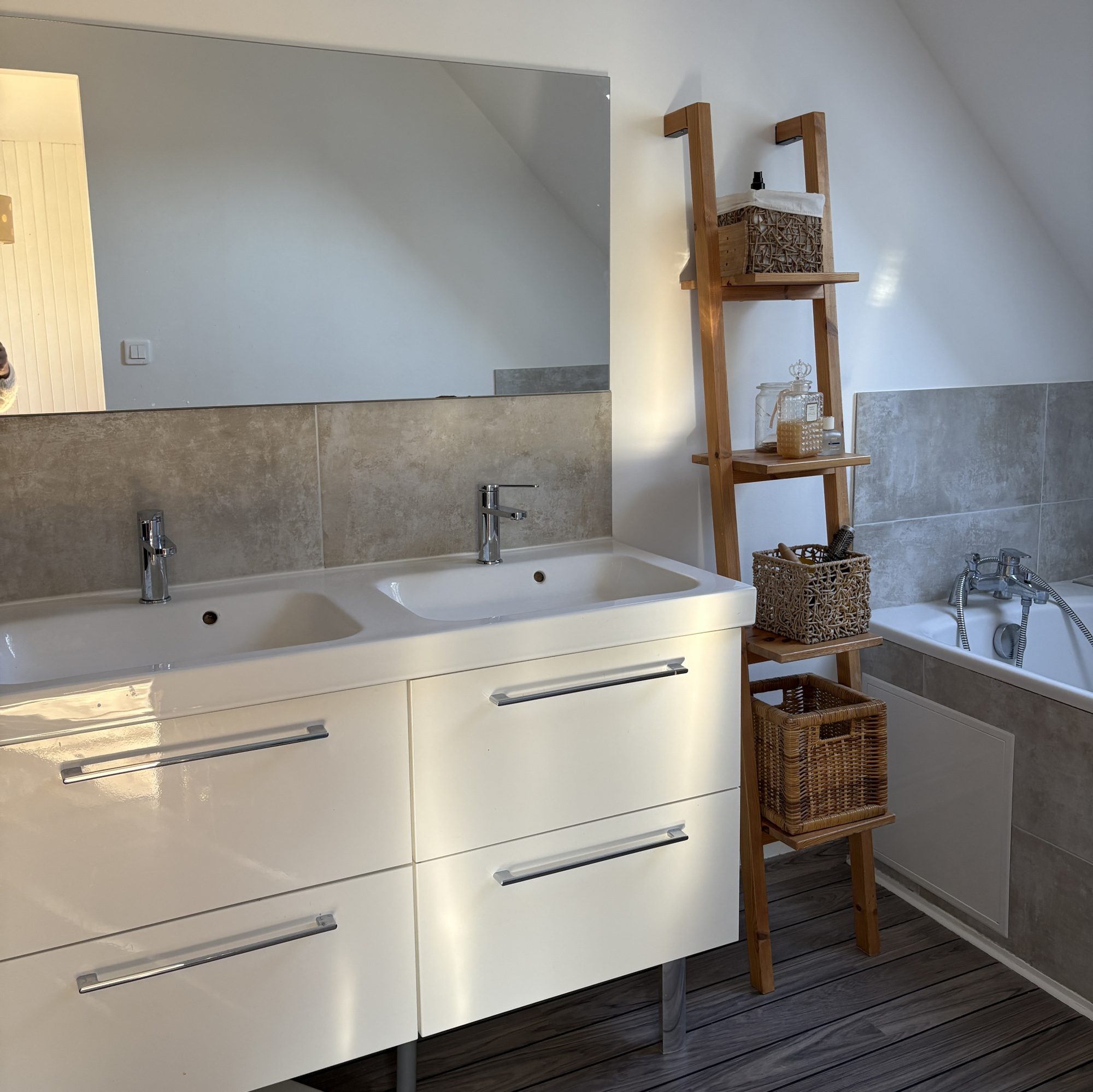 À l'étage, un palier mezzanine dessert une suite parentale comprenant dressing et salle de bains avec baignoire et douche.