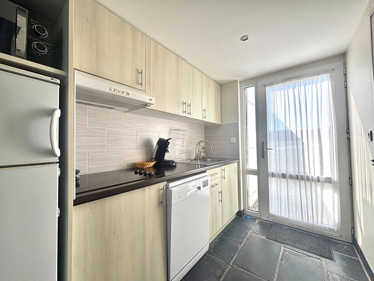 Dès l'entrée, vous découvrirez une kitchenette aménagée et équipée, une salle d'eau, des WC, ainsi qu'un séjour lumineux offrant plusieurs couchages et donnant sur une agréable terrasse privative.