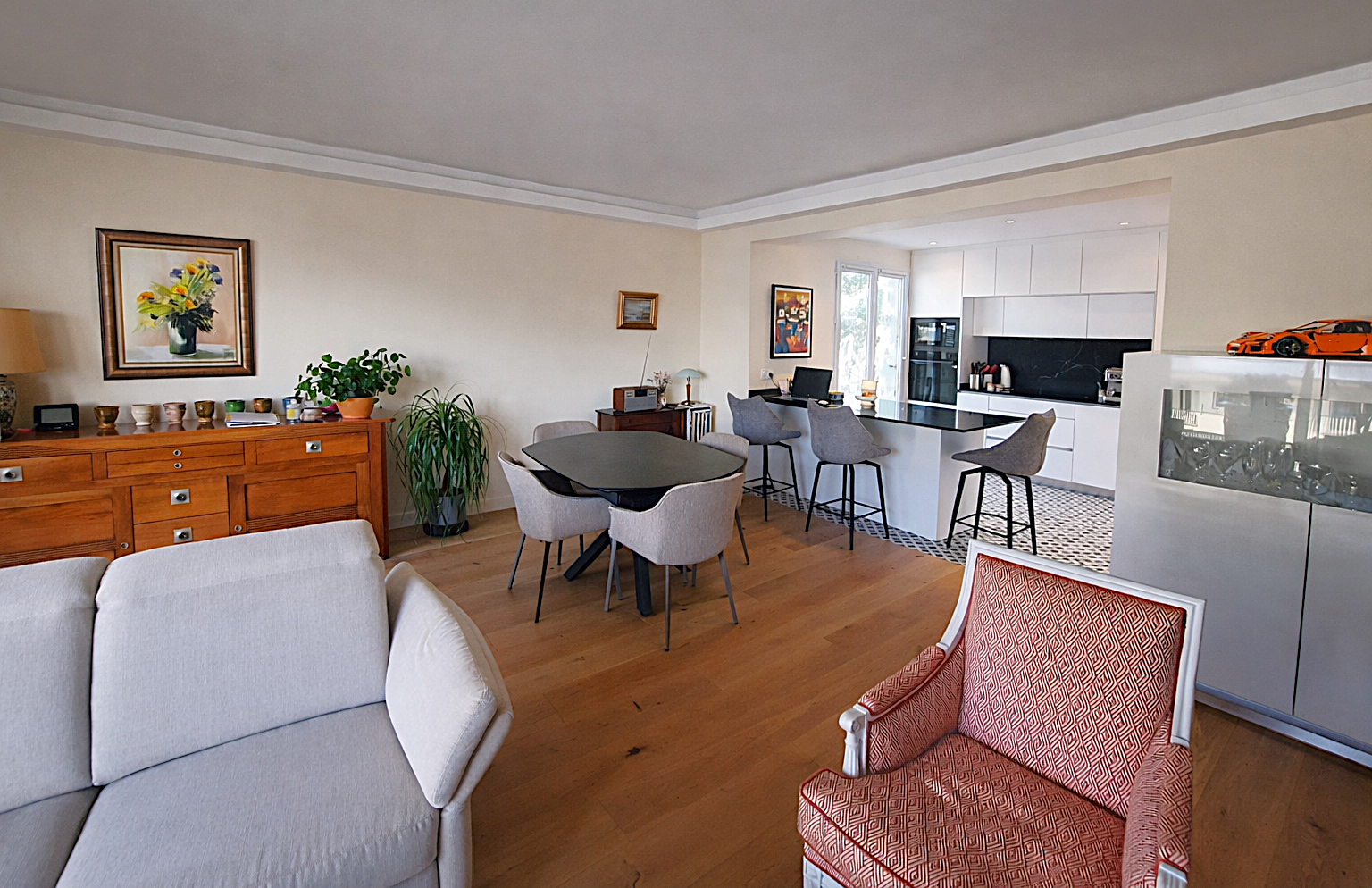 une grande pièce de vie de 42m², très lumineuse, avec cuisine ouverte aménagée et équipée, se prolongeant sur une terrasse exposée à l'ouest et un balcon exposé à l'Est.