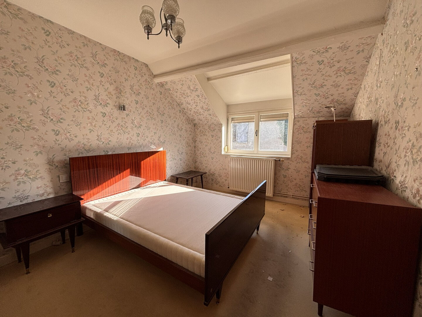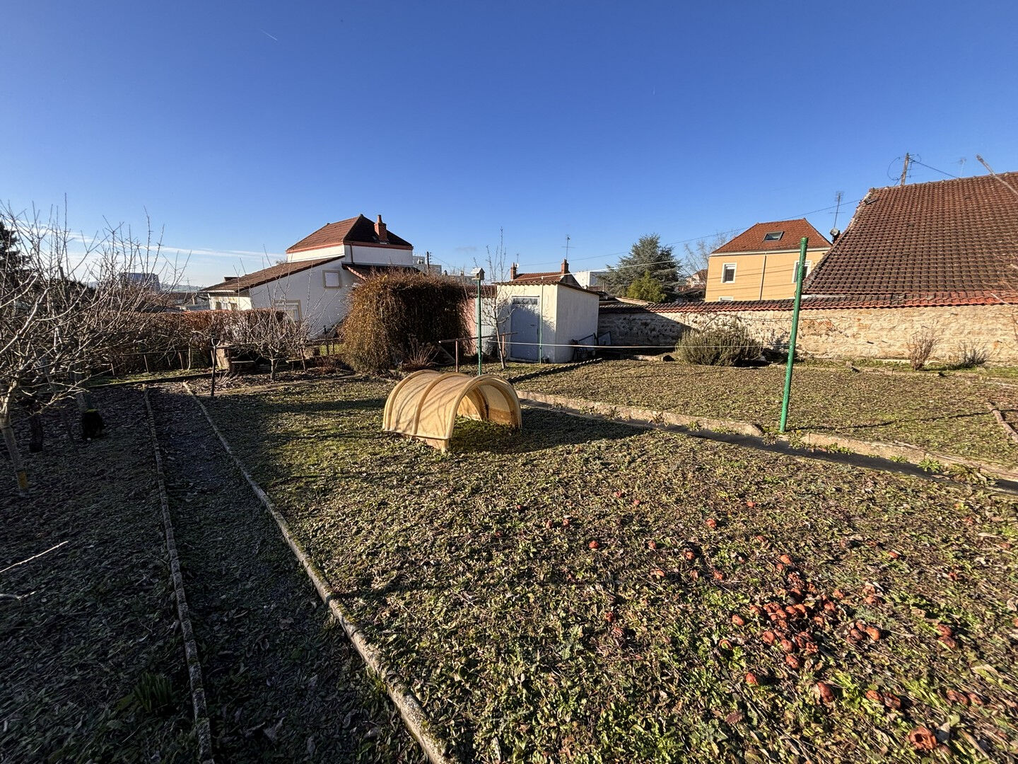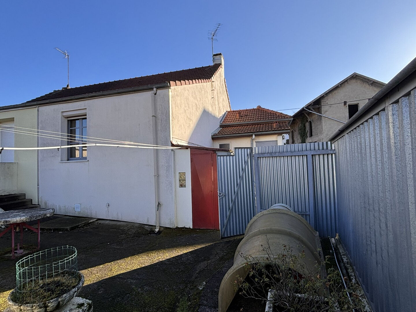 Maison mitoyenne sur caves : Entrée sur cuisine, séjour, salle d'eau + WC, 1 chambre (accès étage). Etage : 1 chambre sous combles. 2 caves / chaufferie (CC gaz). Terrain clos et arboré de 718 m² env. 2 garages en tôles. Puits. Jardin avec abri. Petit budget. Quartier calme. Jardin potager.