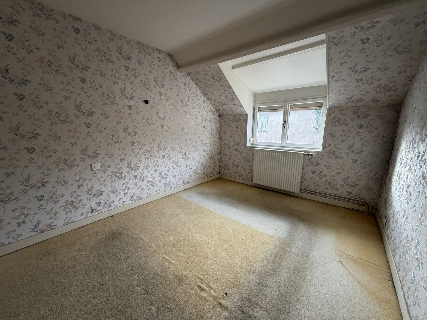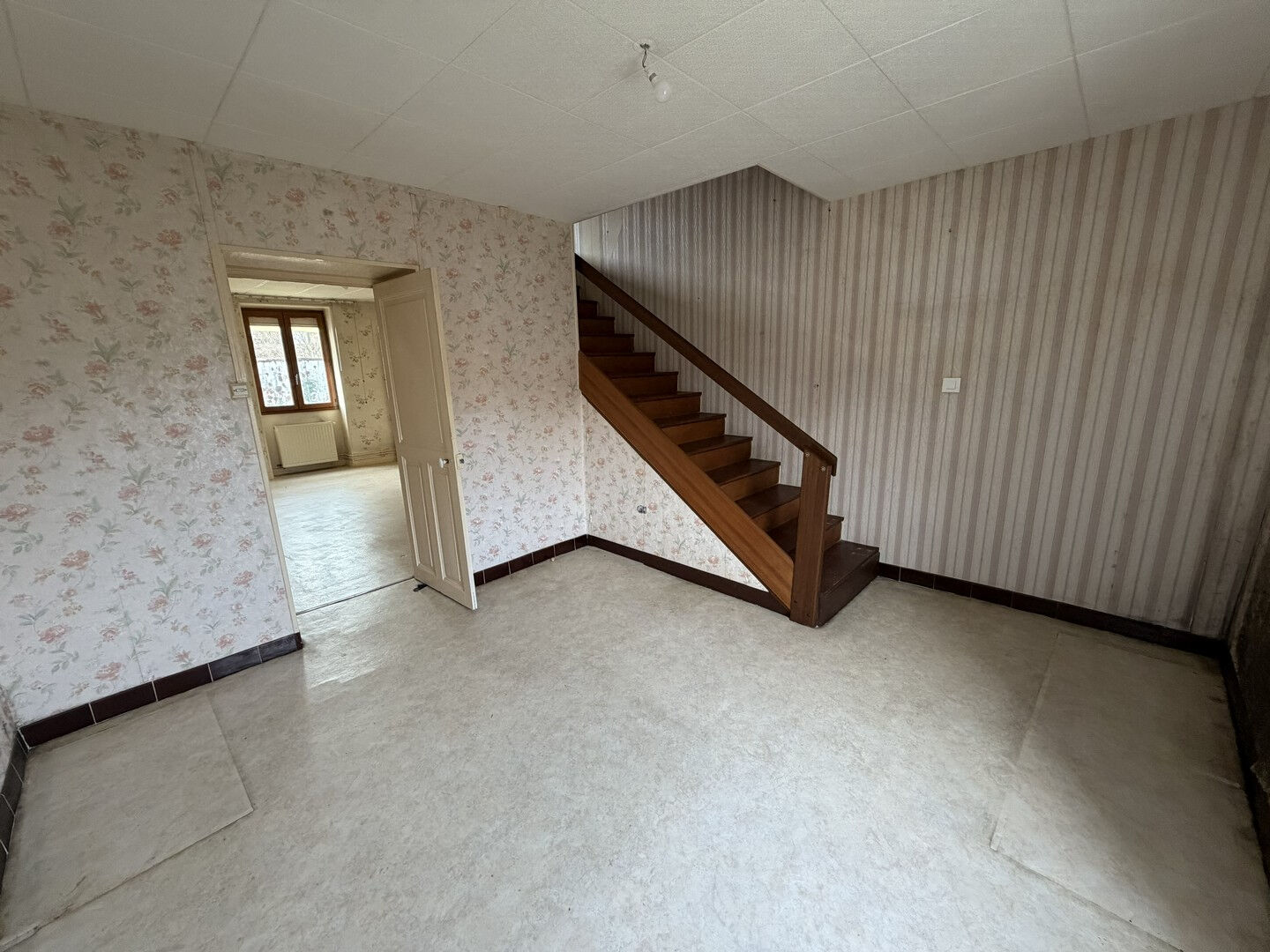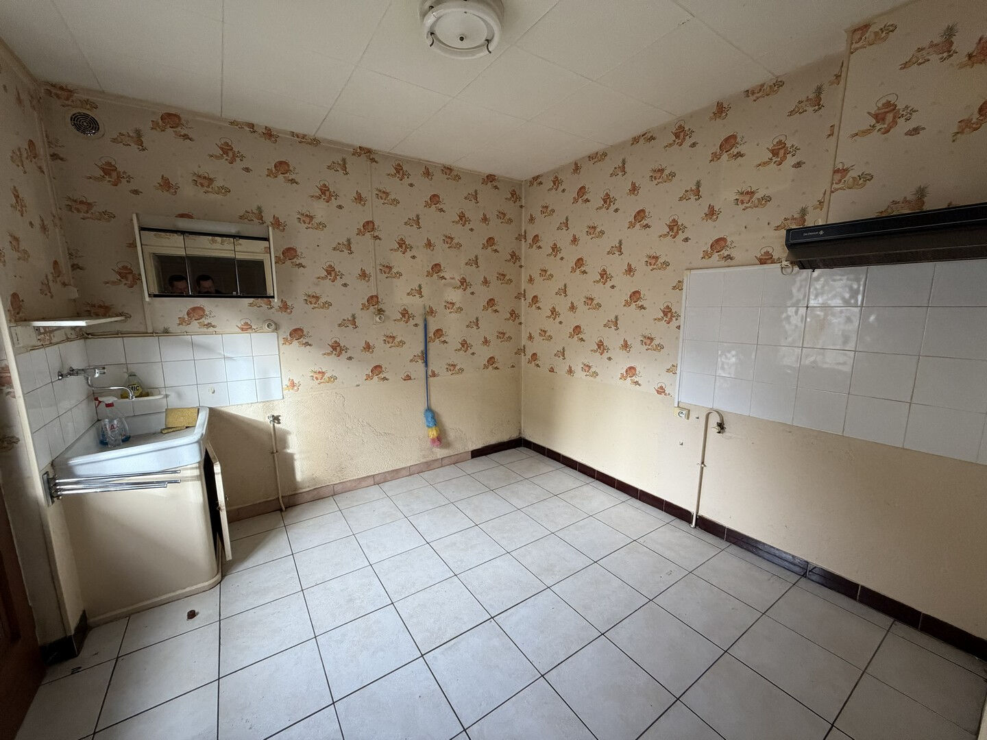 Maison mitoyenne sur caves : Entrée sur cuisine, séjour, salle d'eau + WC, 1 chambre (accès étage). Etage : 1 chambre sous combles. 2 caves / chaufferie (CC gaz). Terrain clos et arboré de 718 m² env. 2 garages en tôles. Puits. Jardin avec abri. Petit budget. Quartier calme. Jardin potager.