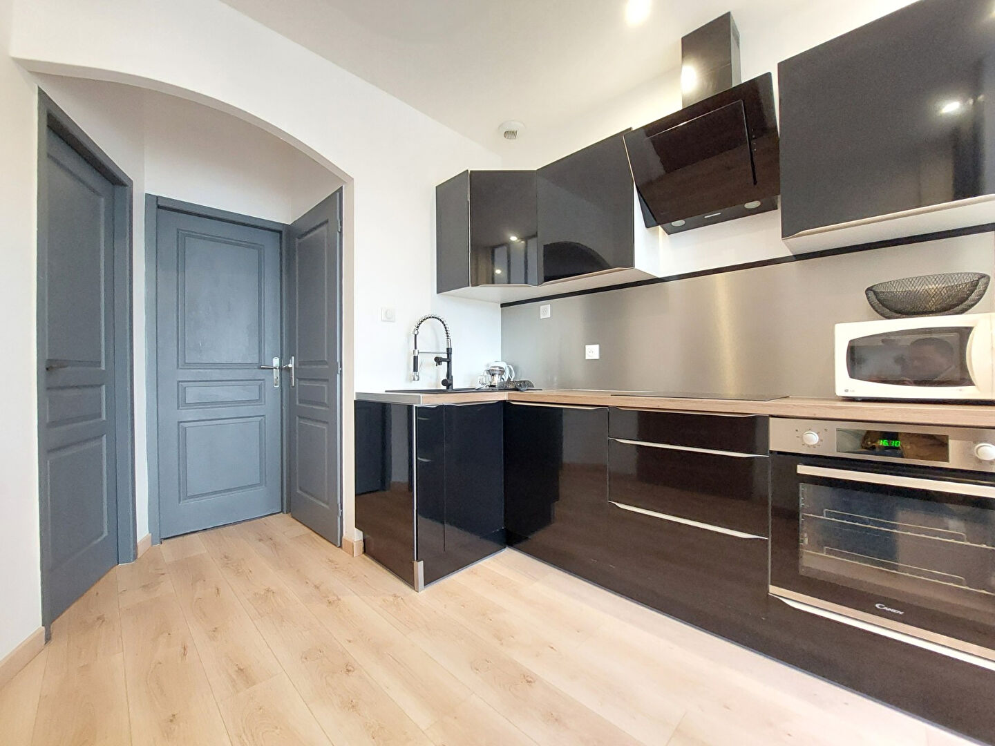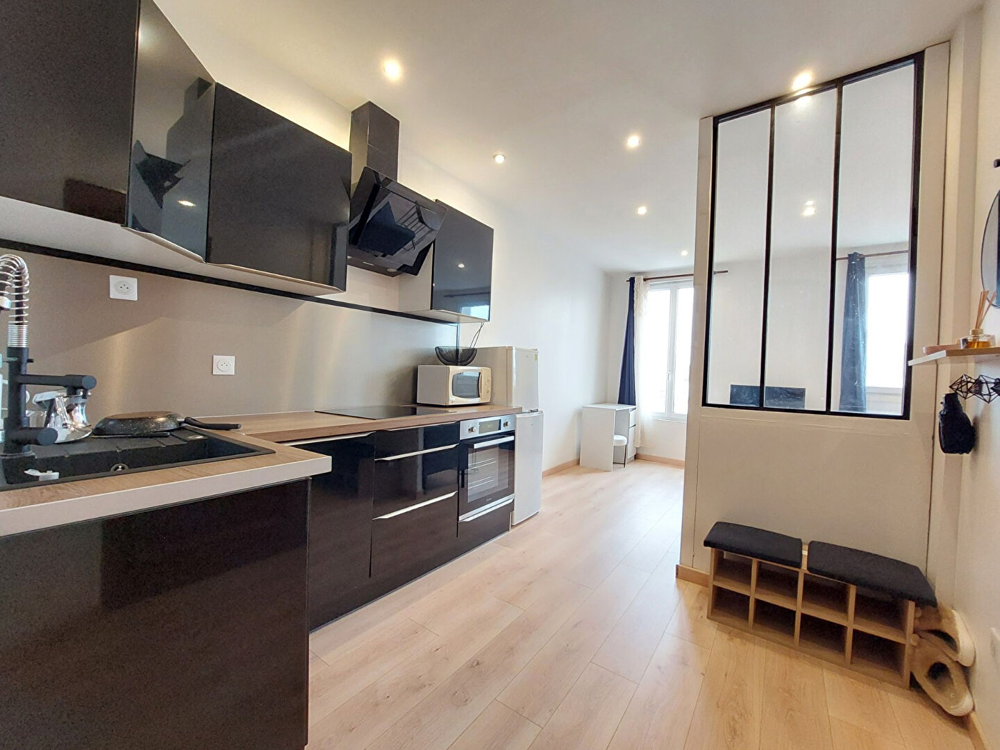 Centre-historique de Rochefort, à 2 pas des Thermes, lumineux appartement T2 traversant de 39,45 m² comprenant séjour avec cuisine aménagée-équipée ouverte, dégagement, chambre, salle d'eau, WC séparé et cave.