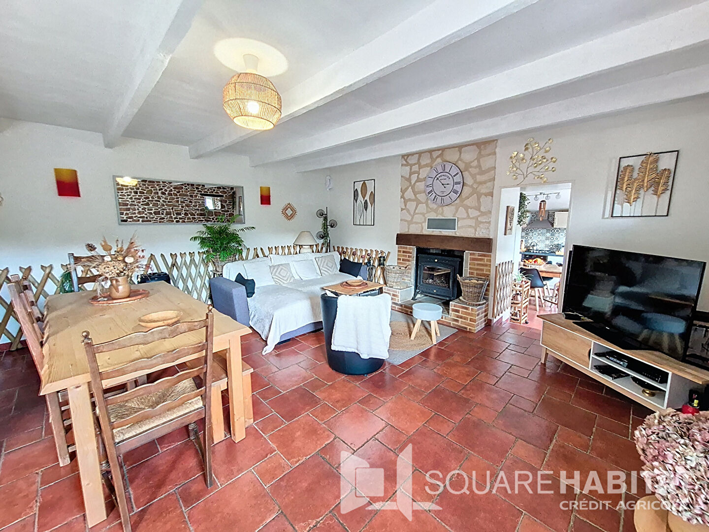 La maison principale en pierres, exposée SUD se compose d'une cuisine aménagée et équipée, confortable séjour esprit maison de campagne avec cheminée, pierres apparentes, poutres et tomettes, salon baigné de lumière avec accès directe à la terrasse bois et au jardin, une chambre avec mezzanine, salle d'eau avec wc