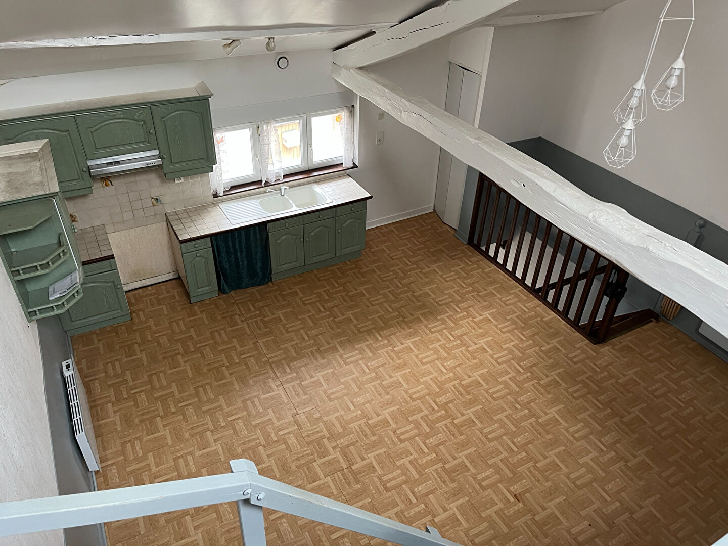 L'espace de vie , à l'étage dispose d'une pièce à vivre d'env.30m² avec cuisine aménagée lumineuse, deux chambres, salle de bains avec double vasque, toilettes, et une mezzanine de 19m² .