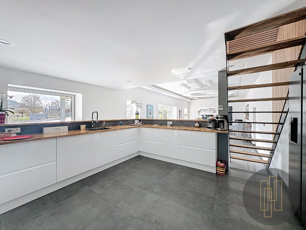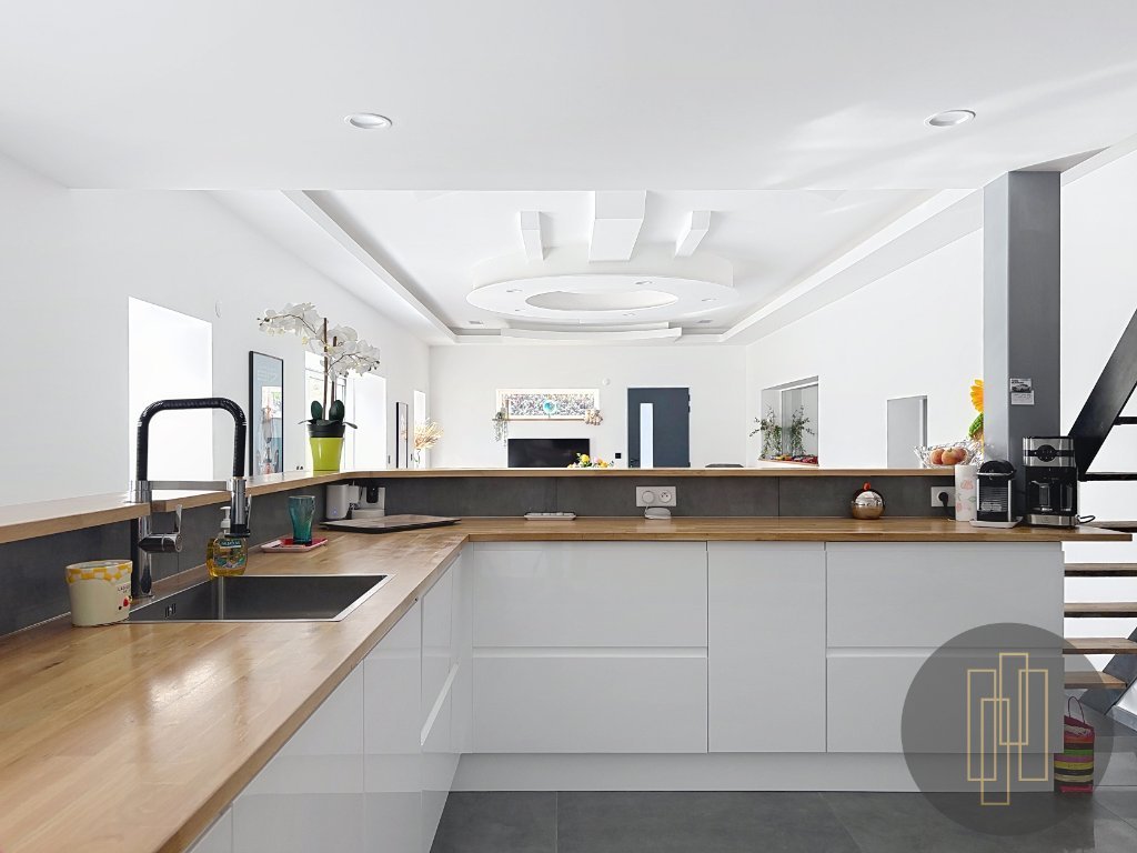 Un espace garage de 120 m² comprenant un bureau, un atelier et un volume dédié au stationnement complète la propriété. Conçu comme un volume à part entière, il offre de multiples possibilités d'usage et s'intègre à l'architecture de la maison.
