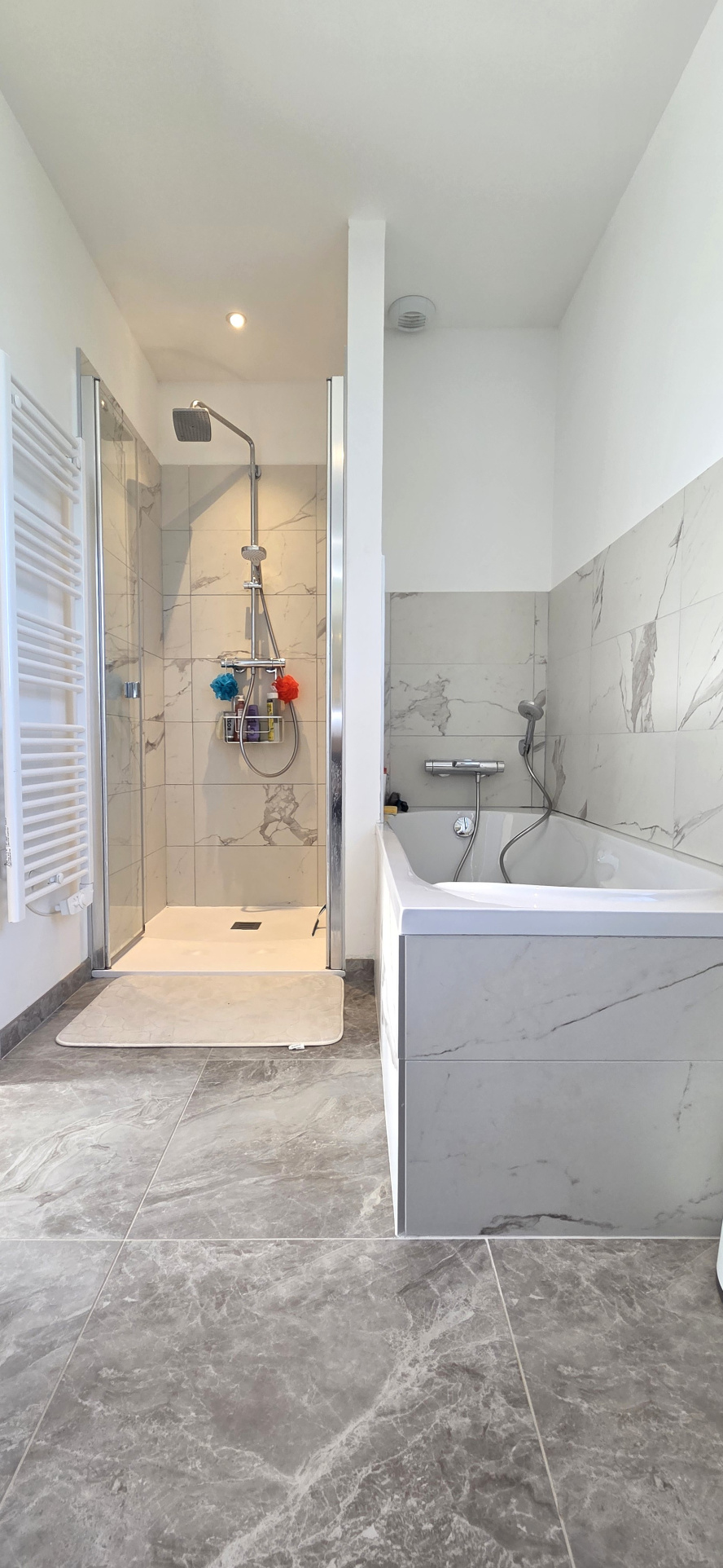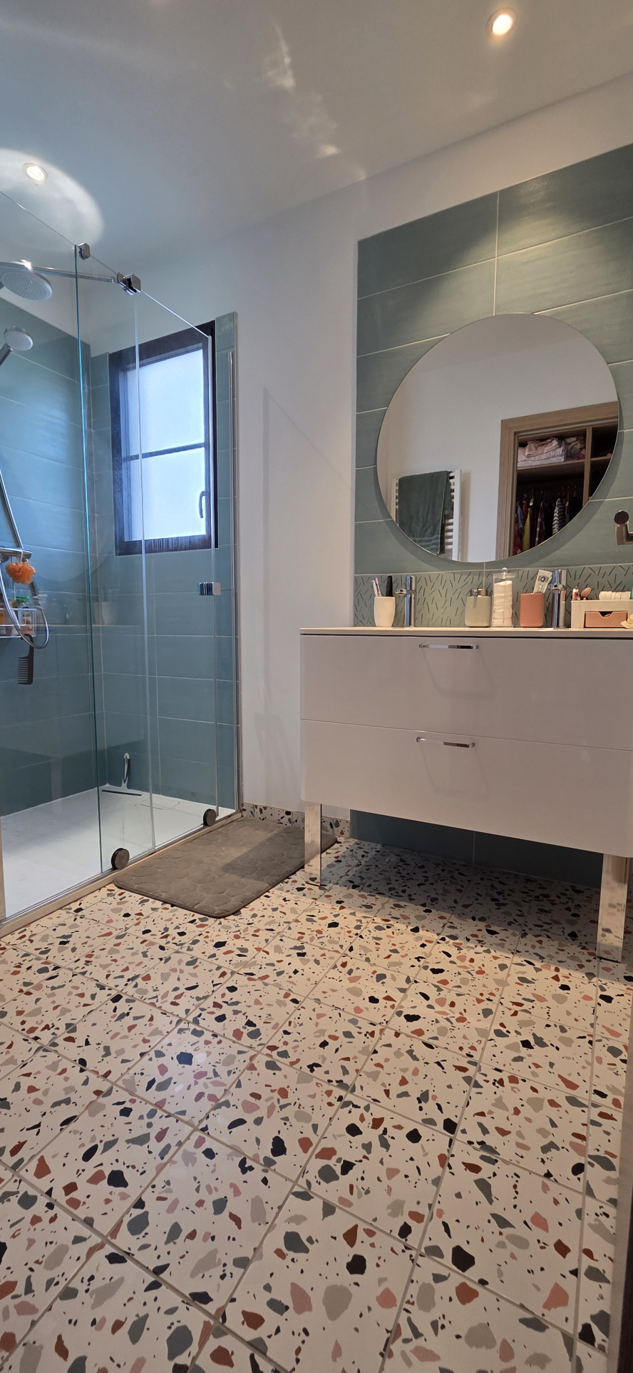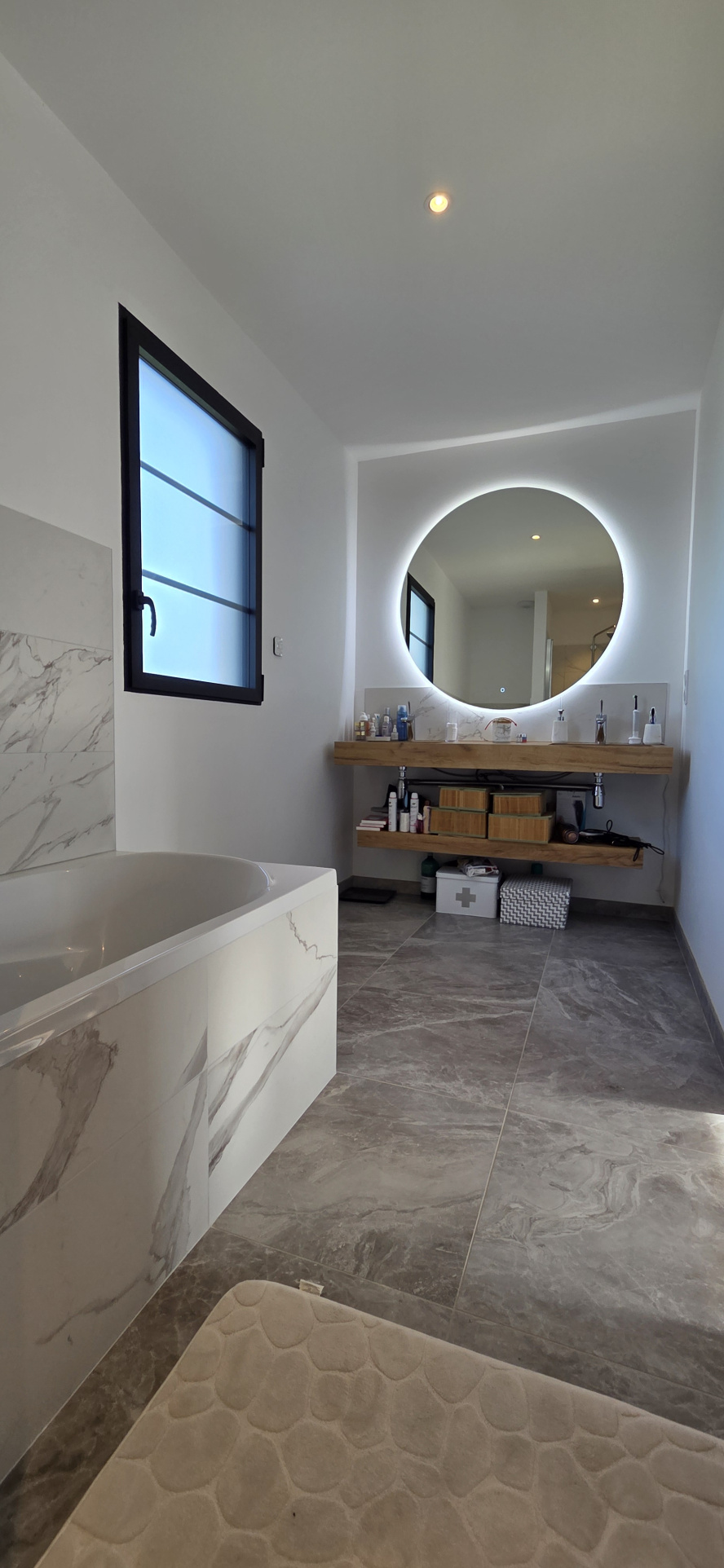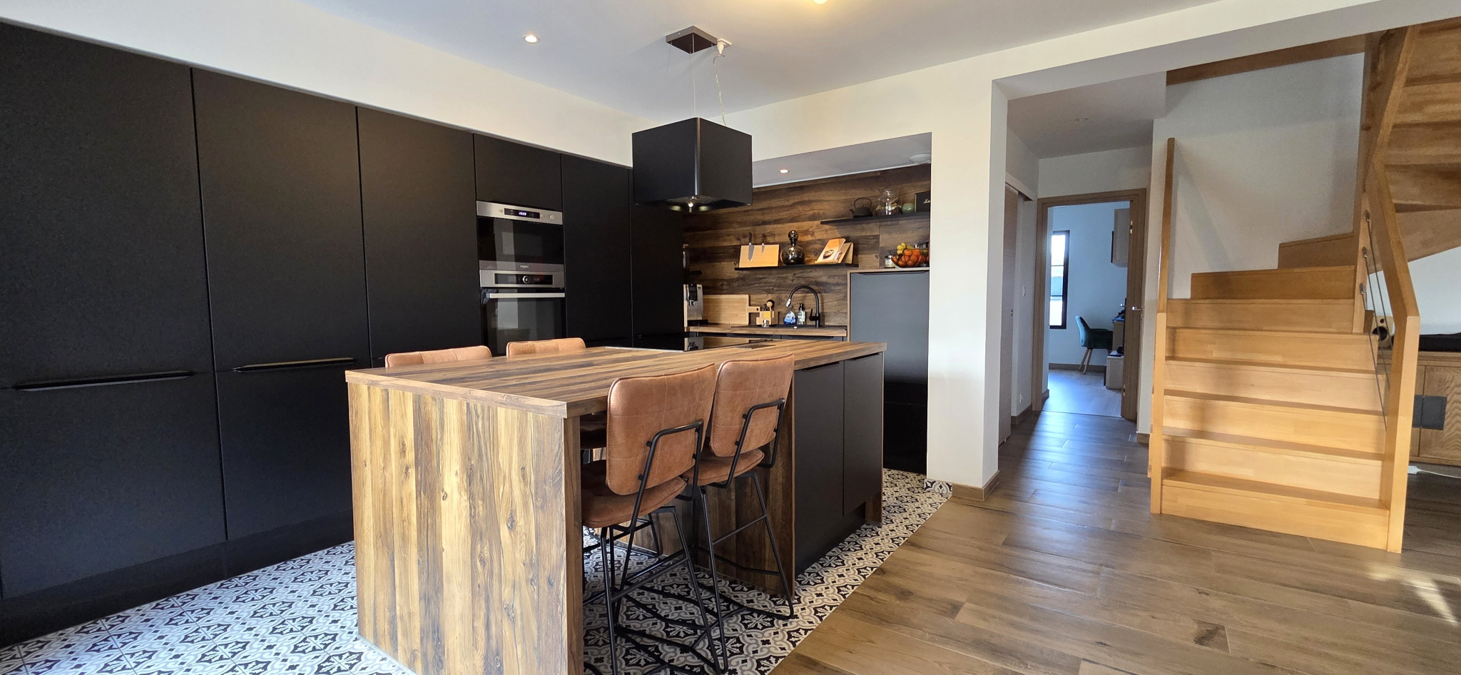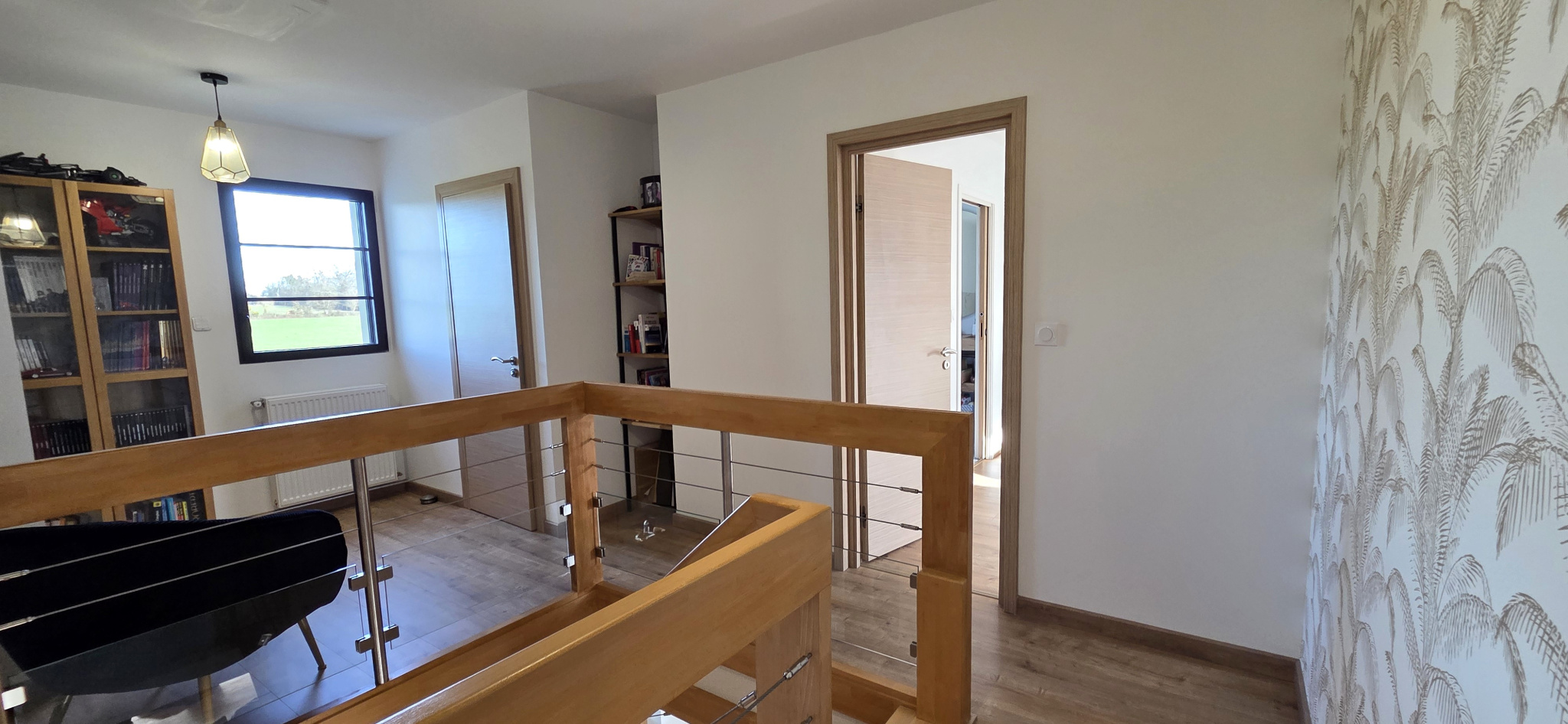 À l'étage, une mezzanine dessert trois chambres confortables. Une première avec dressing et salle de bains privative (douche et baignoire). Deux autres avec chacune un accès au dressing et salle d'eau. WC indépendant.