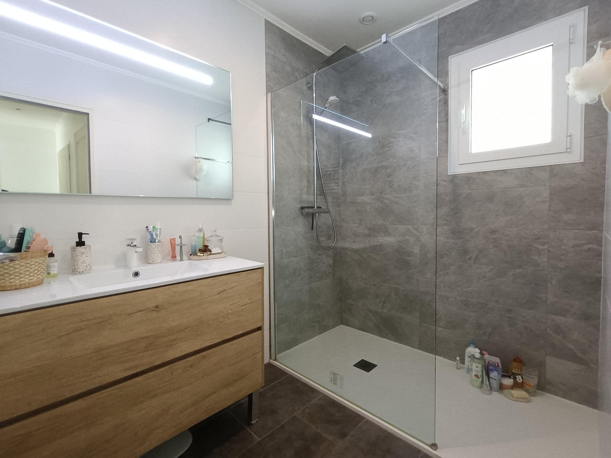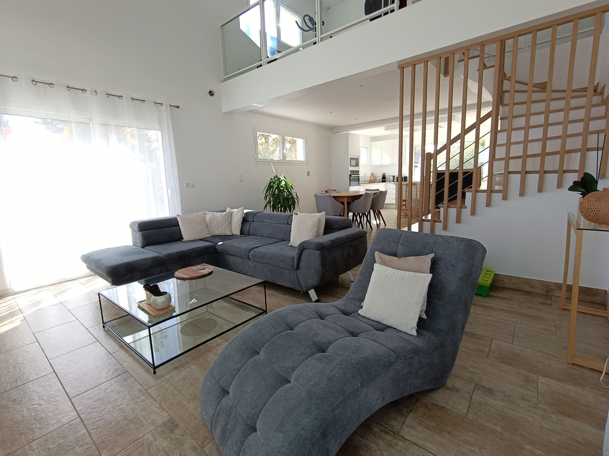 Une grande mezzanine, ouverte sur le salon, apporte caractère et polyvalence, idéale pour un espace bureau, lecture ou détente.
