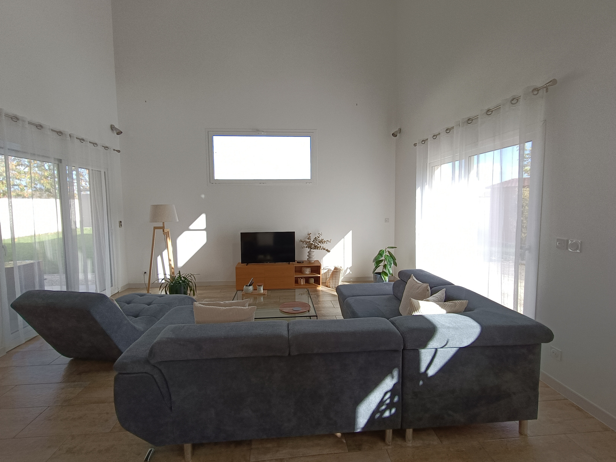 La maison s'ouvre sur une pièce de vie baignée de lumière, avec une cuisine ouverte sur le séjour, prolongée par un salon au magnifique toit cathédrale, créant une atmosphère à la fois chaleureuse et élégante.