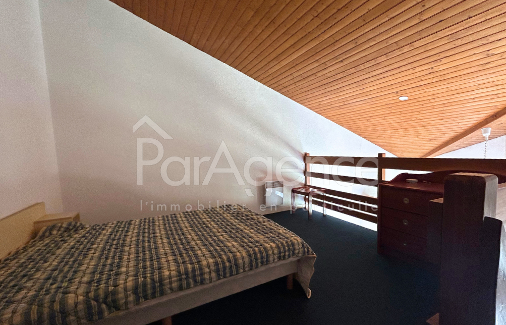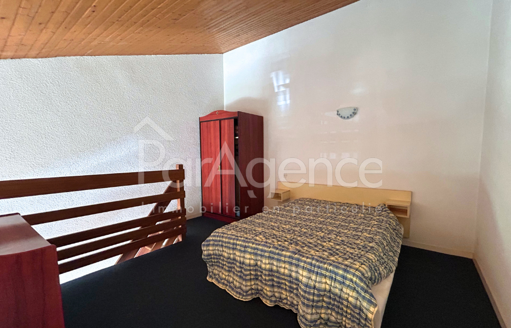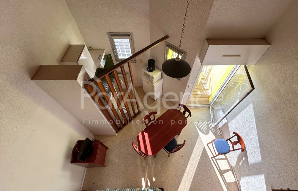 L'entrée dessert un séjour lumineux ouvrant sur un balcon-terrasse de 5,40 m2, véritable prolongement extérieur pour profiter de l'air marin. La cuisine attenante, dotée de fenêtres, bénéficie d'une lumière naturelle appréciable. Une salle d'eau avec WC complète ce niveau. À l'étage, la mezzanine très haute sous plafond accueille un espace nuit ou bureau, selon les usages, renforçant le caractère duplex et la sensation de volume. L'appartement est vendu meublé, prêt à être utilisé ou exploité. En option, il est possible d'acquérir un stationnement extérieur avec cave ou un garage, un vrai plus dans ce secteur très convoité. Visite virtuelle disponible sur demande.