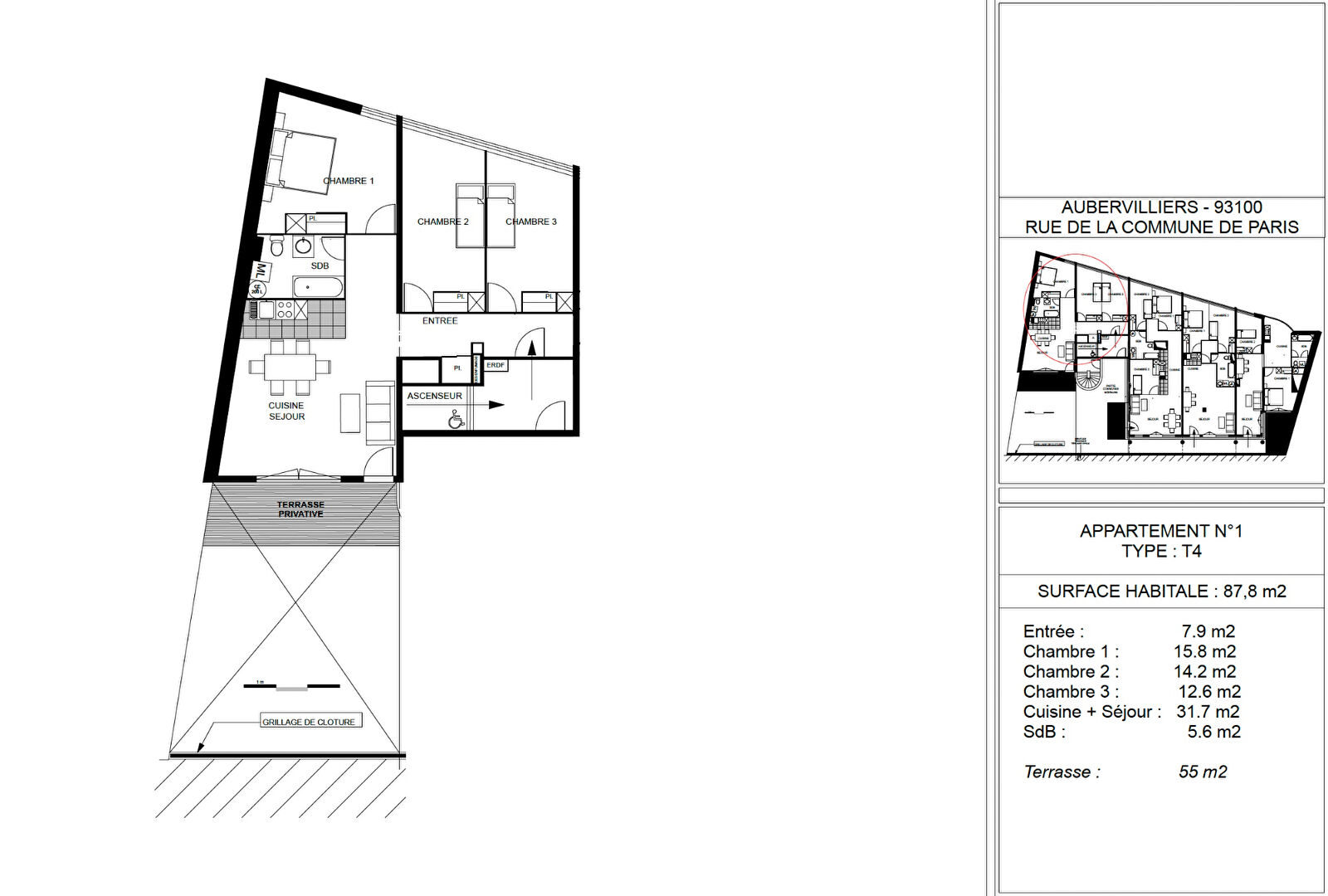 Sans perte de place, il se compose d'une entrée, couloir distribuant en étoile séjour avec cuisine US de 31m², 3 chambres de 12, 14 et 16m², salle de bains avec WC.
