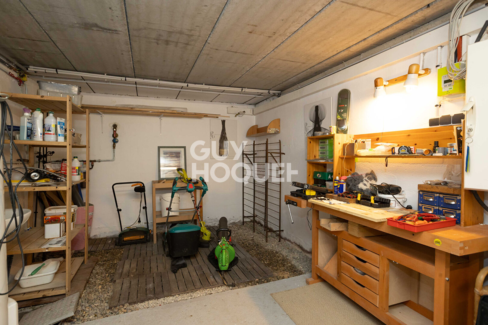 Sous-sol total comprenant : un garage double (possibilité de stationner un véhicule supplémentaire à l'avant de la maison), une buanderie, un espace atelier et une salle de jeux avec accès direct au jardin.