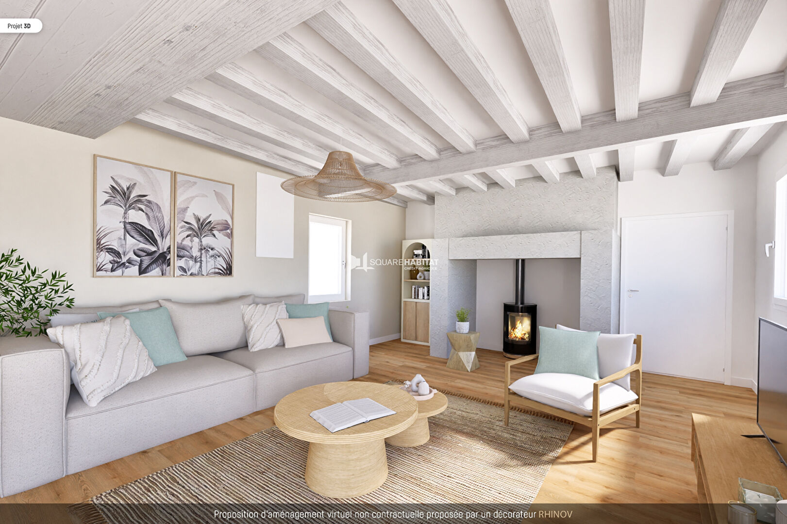 Une cuisine aménagée, un séjour / salon avec insert bois, un dégagement, une salle de bain et un WC indépendant.
