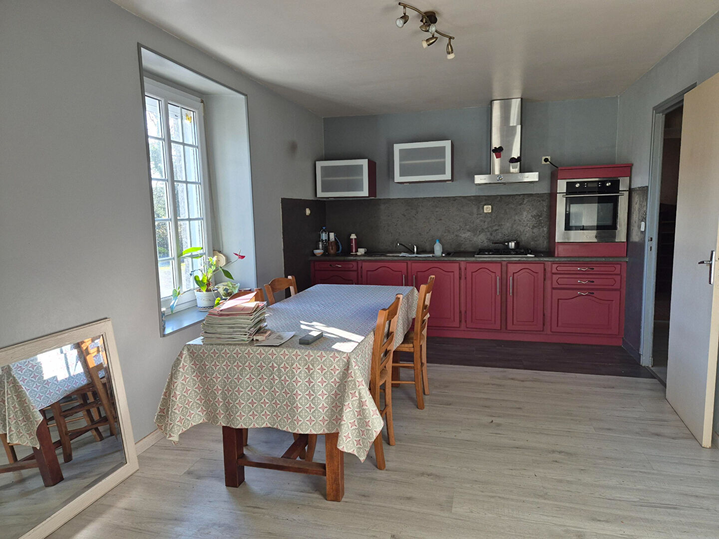 La maison se compose au rez-de-chaussée d'une entrée, d'une cuisine ouverte sur le salon, agrémentée d'un insert bois, une chambre, une salle de bains et des WC.
