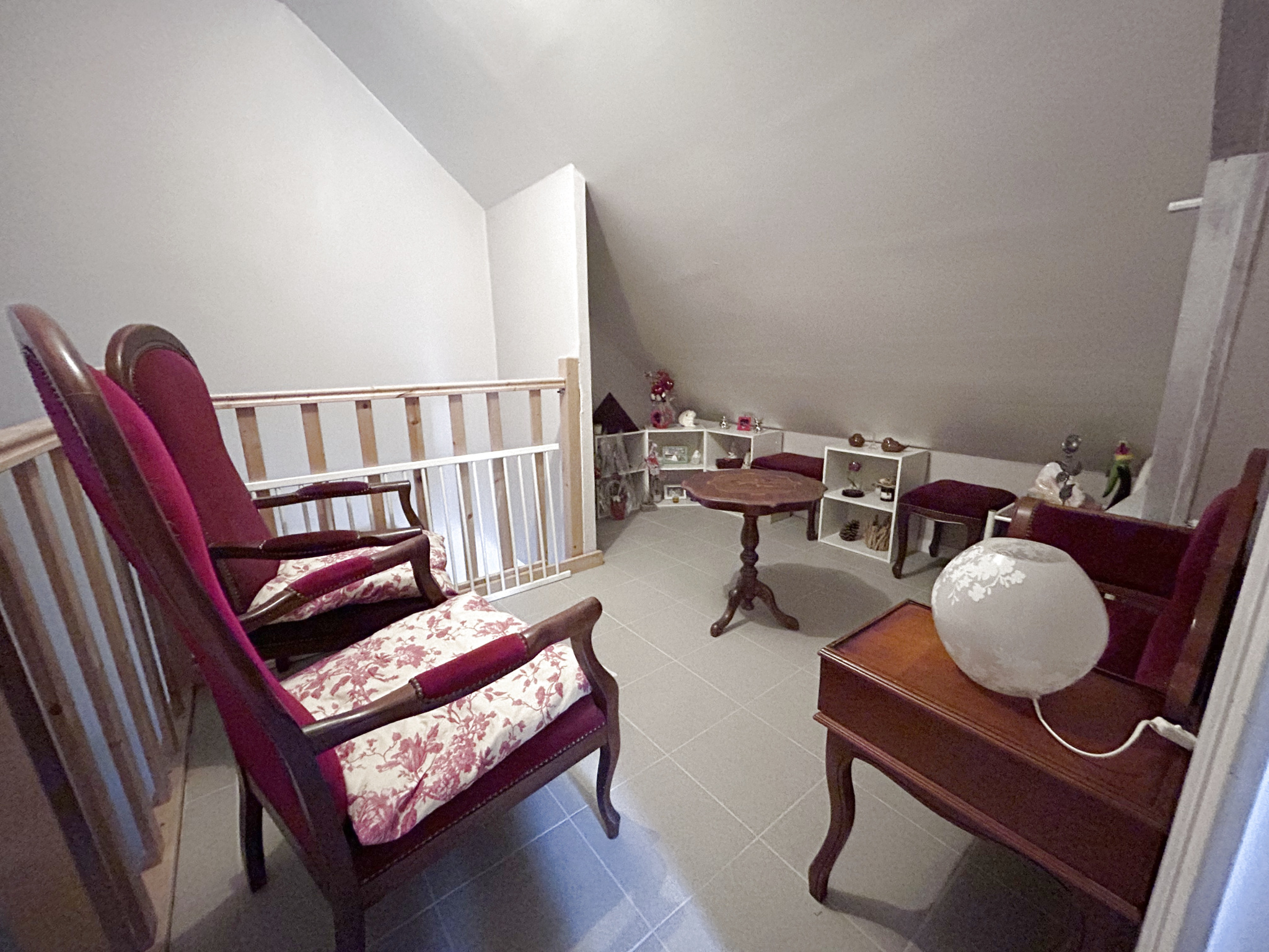 A l'étage : un palier pouvant servir de bureau, 3 chambres dont une avec dressing, une salle d'eau et un WC.