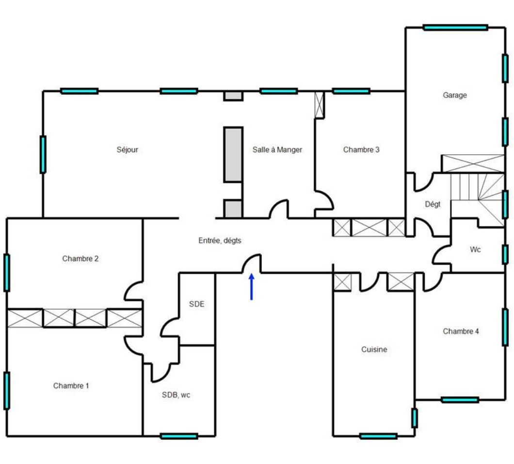 Depuis l'allée, on accède à la maison par un agréable patio ombragé, dominé par un faux-poivrier, qui crée une ambiance aux accents andalous. L'agencement actuel comprend un séjour spacieux avec cheminée, ouvert sur le côté ouest du jardin, une cuisine indépendante, quatre chambres, une salle de bains avec WC, une salle d'eau ainsi qu'un WC indépendant.