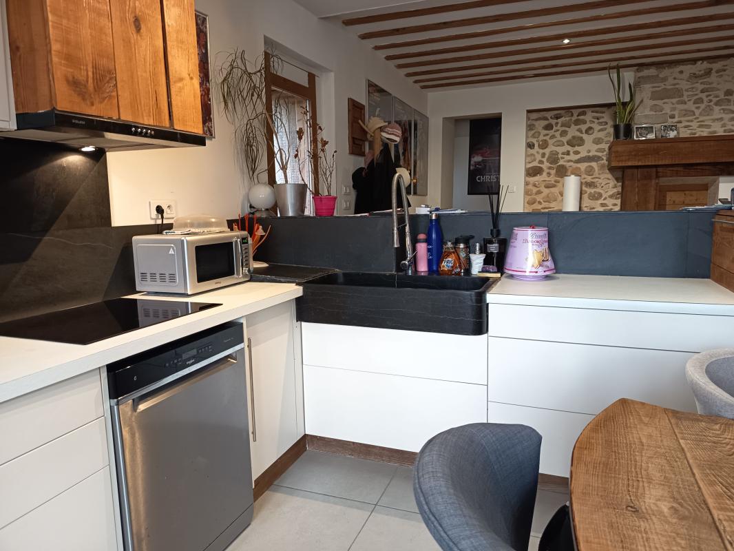 Le séjour, ouvert sur la cuisine et agrémenté d'un poêle à bois très performant crée une atmosphère chaleureuse.