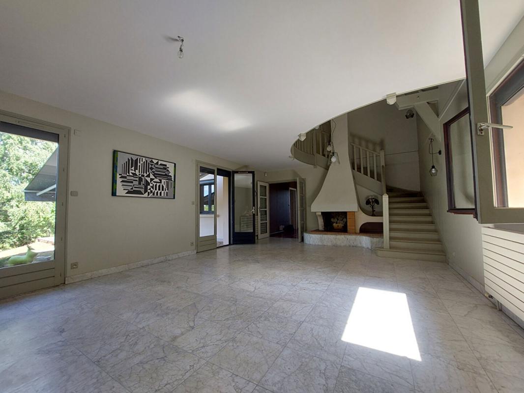 Le séjour/salon, généreux et lumineux, dispose d'une cheminée conviviale et donne accès à une terrasse grâce à deux portes-fenêtres.