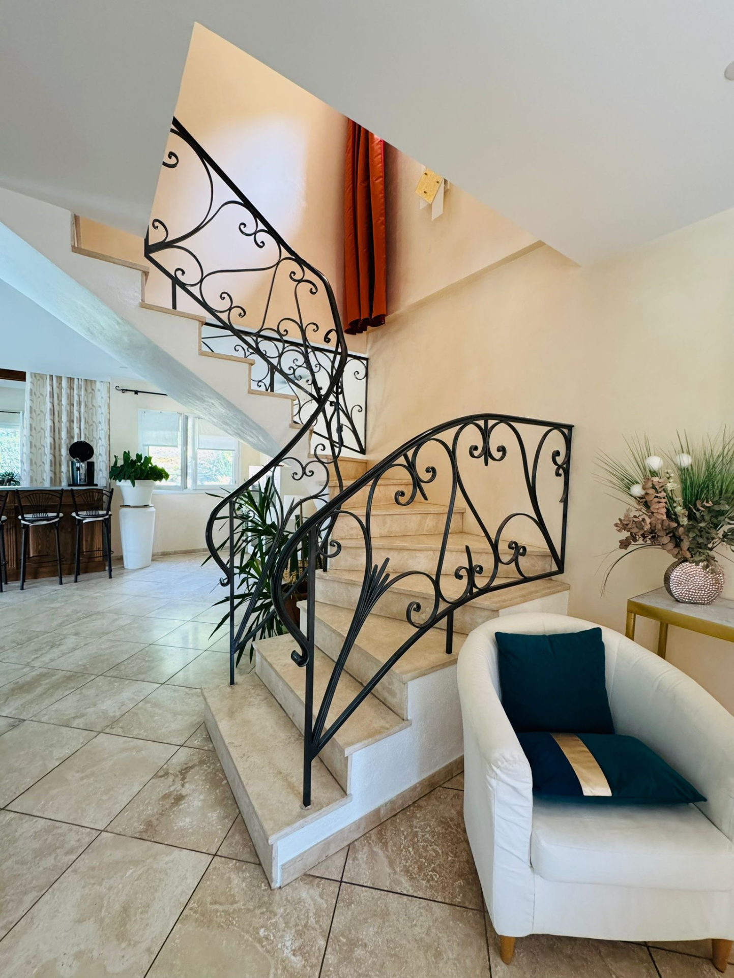 Elle se compose, au rez-de-chaussée, d'une spacieuse pièce de vie de 108 m2 avec cuisine américaine entièrement équipée ouvrant sur la terrasse avec pergola Bioclimatique, Buanderie, Salle d'eau et WC.