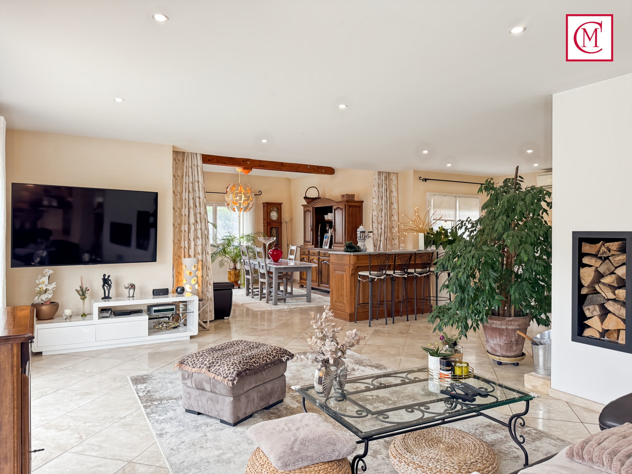Le chauffage est alimenté par une pompe à chaleur réversible + chauffage au sol électrique et poêle à bois.