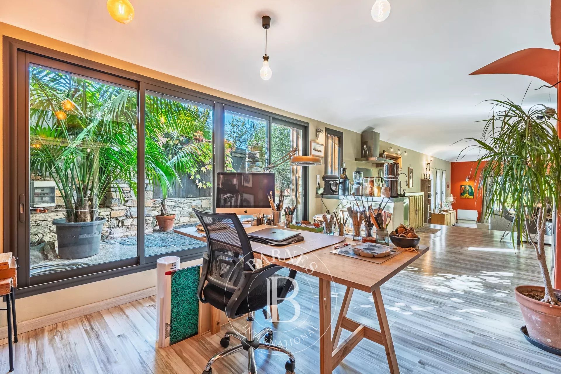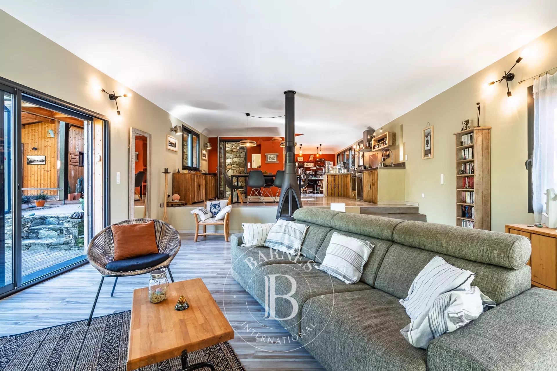 L'ensemble repose sur un terrain paysager d'environ 4 470 m², avec essences rares, arbres fruitiers, piscine au sel de 9,5 x 3,8 m, et espace détente en galets d'Albo. Un garage en bois, transformable, complète l'ensemble.