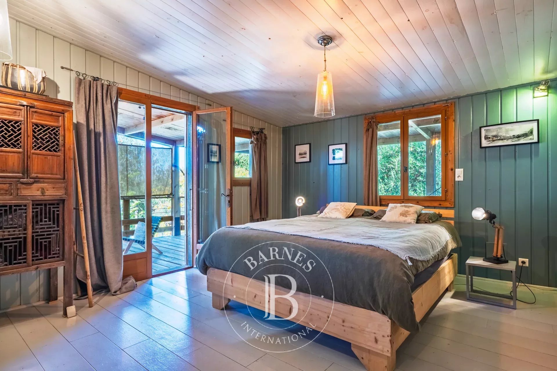 La villa principale d'environ 115 m² offre un séjour lumineux avec poêle à bois, une cuisine américaine équipée en demi-niveau, et 2 chambres, dont une suite parentale avec terrasse sur pilotis.