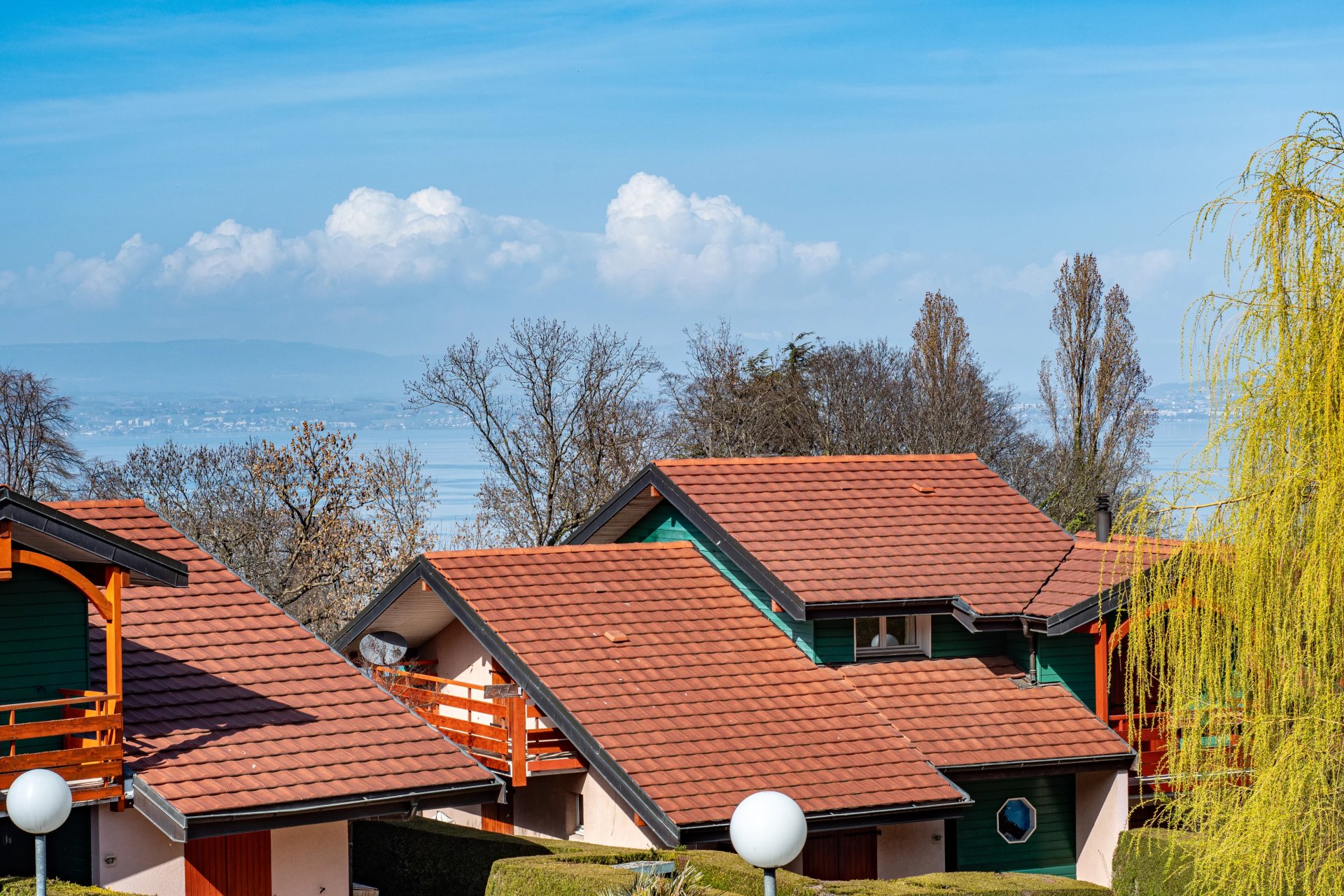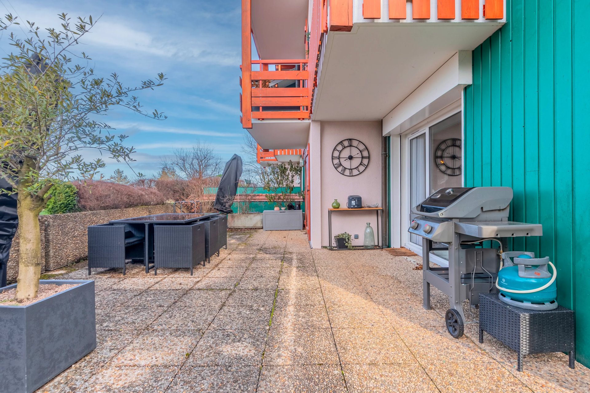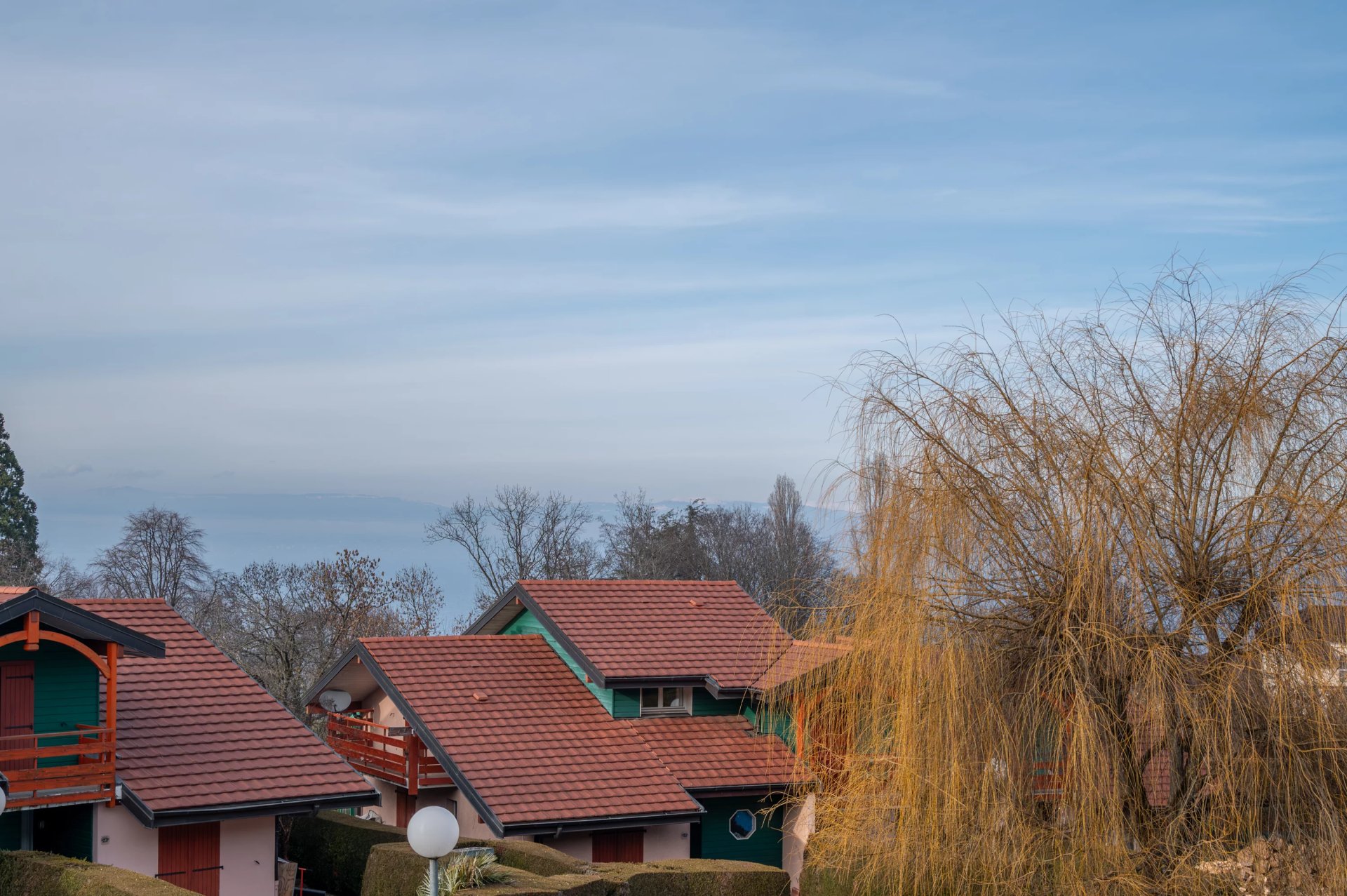 Une baie vitrée au nord donne également accès à la terrasse, offrant une agréable perspective sur le lac à l’horizon et les espaces verts de la copropriété, particulièrement soignés et propices à un cadre de vie verdoyant et fleuris.
