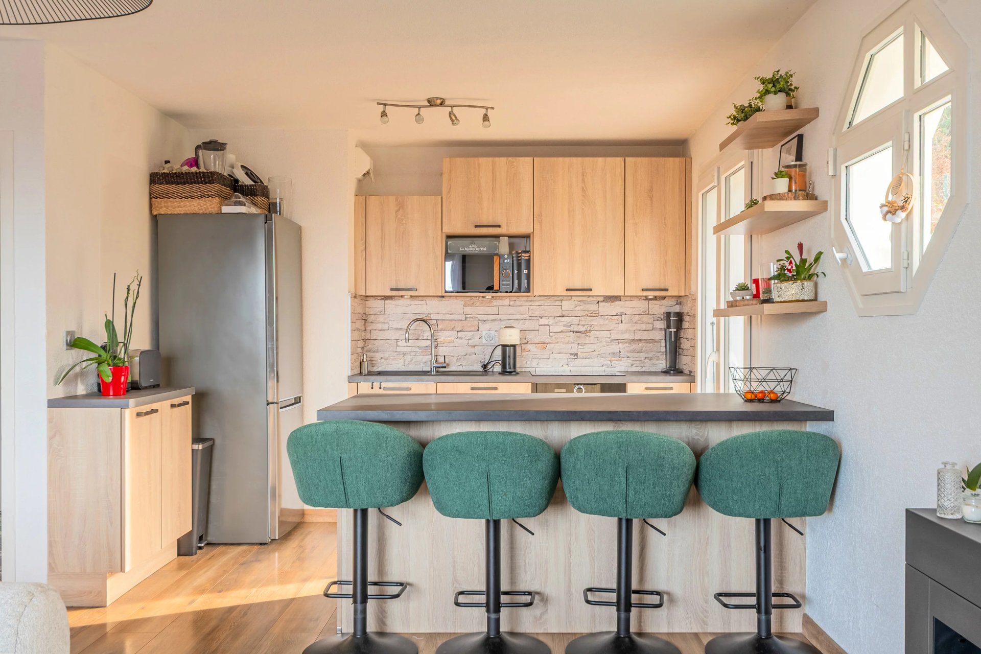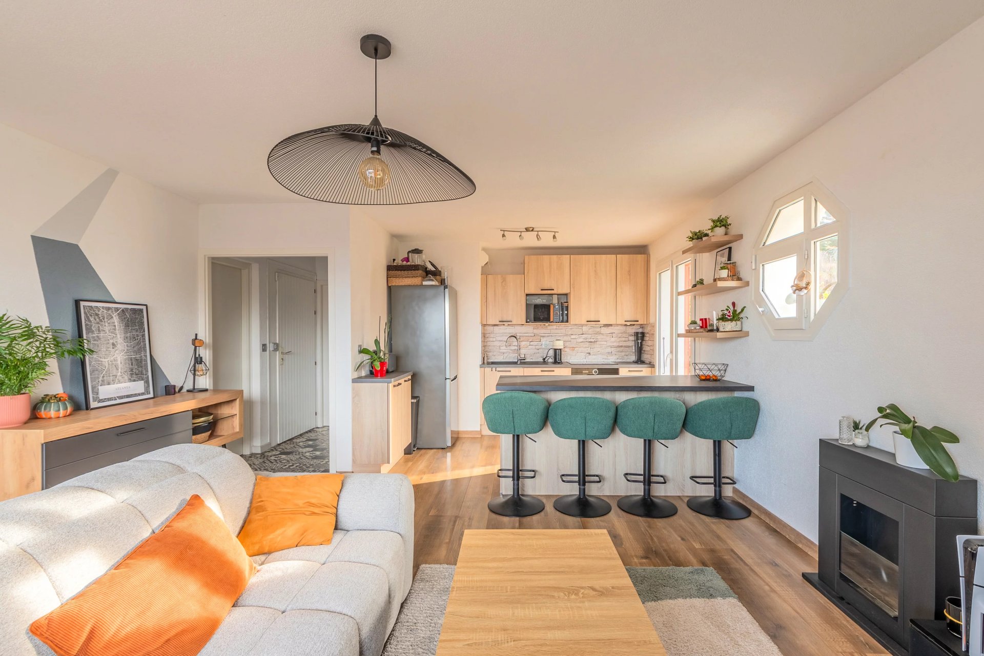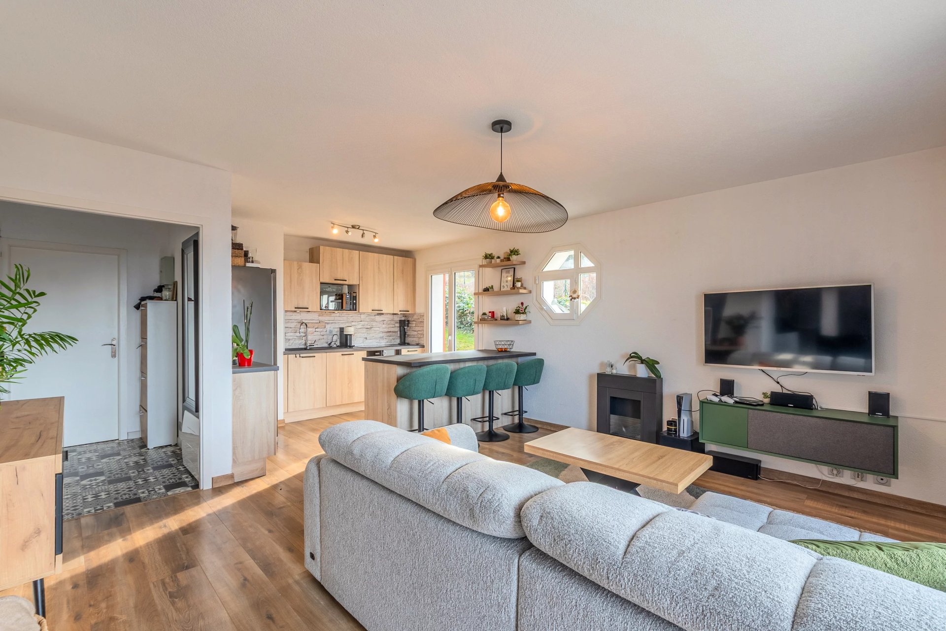 L’entrée dessert une belle pièce de vie avec salon-séjour et cuisine ouverte équipée, agrémentée d’un îlot central, idéale pour les moments de convivialité.