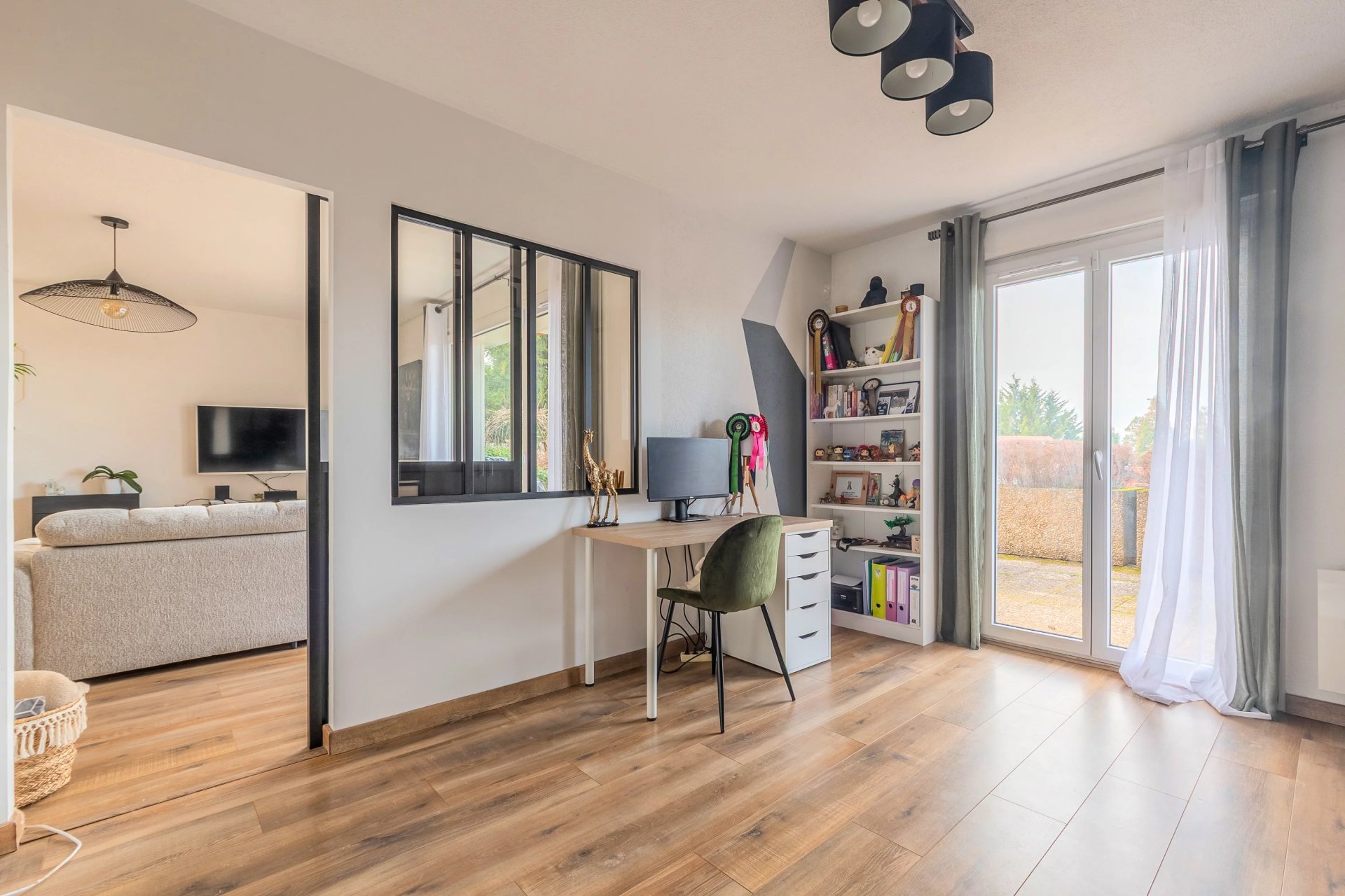 Une pièce pouvant faire office de salon, chambre d’appoint ou bureau, est séparée par une élégante verrière avec porte coulissante vitrée, apportant charme et luminosité.
