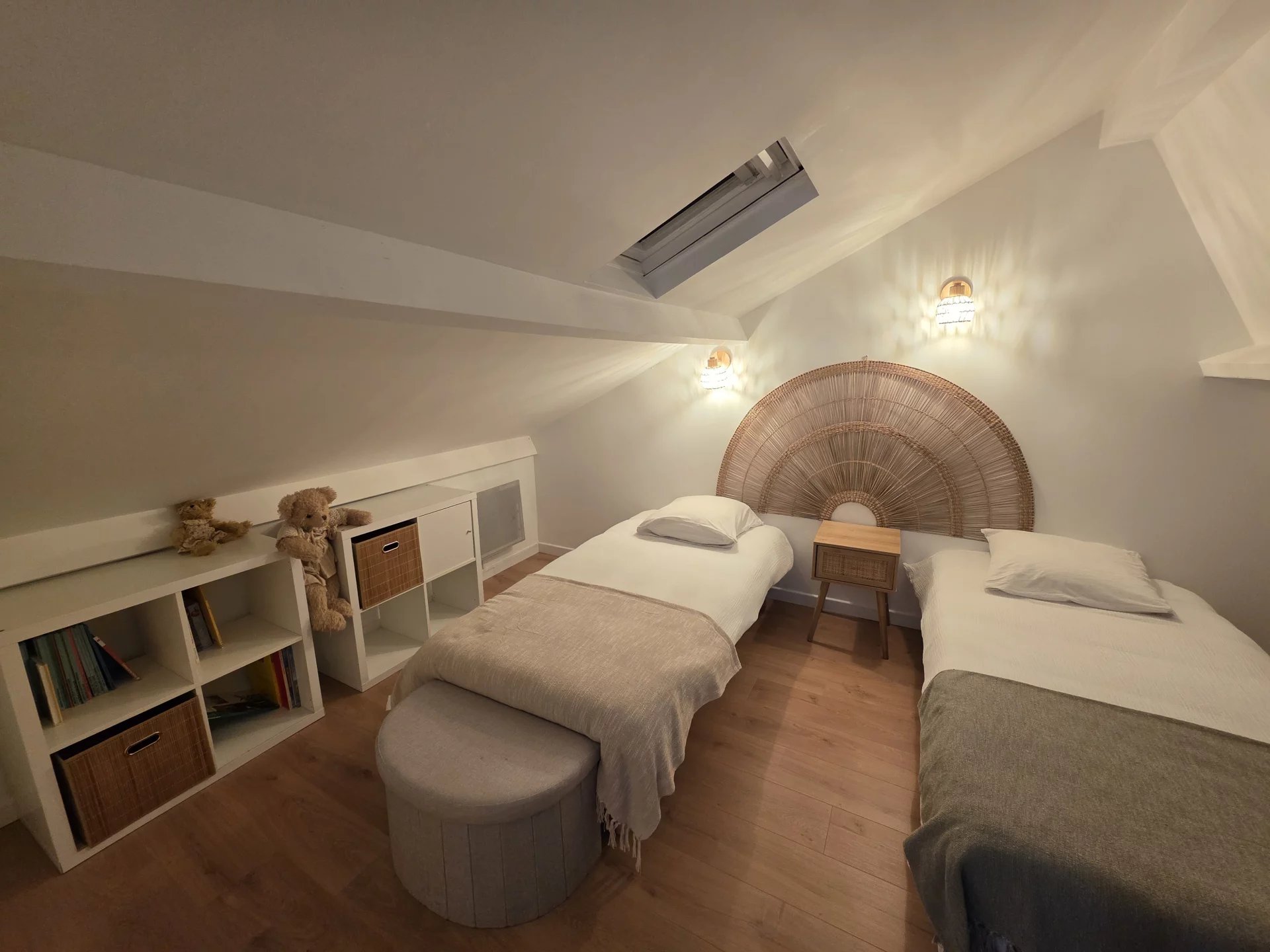 Composée d'un grand rez-de-chaussée ouvert sur le jardin avec chambre de plain pied. A l'étage 3 pièces aujourd'hui aménagée pour de la location touristique, petite vue mer.
