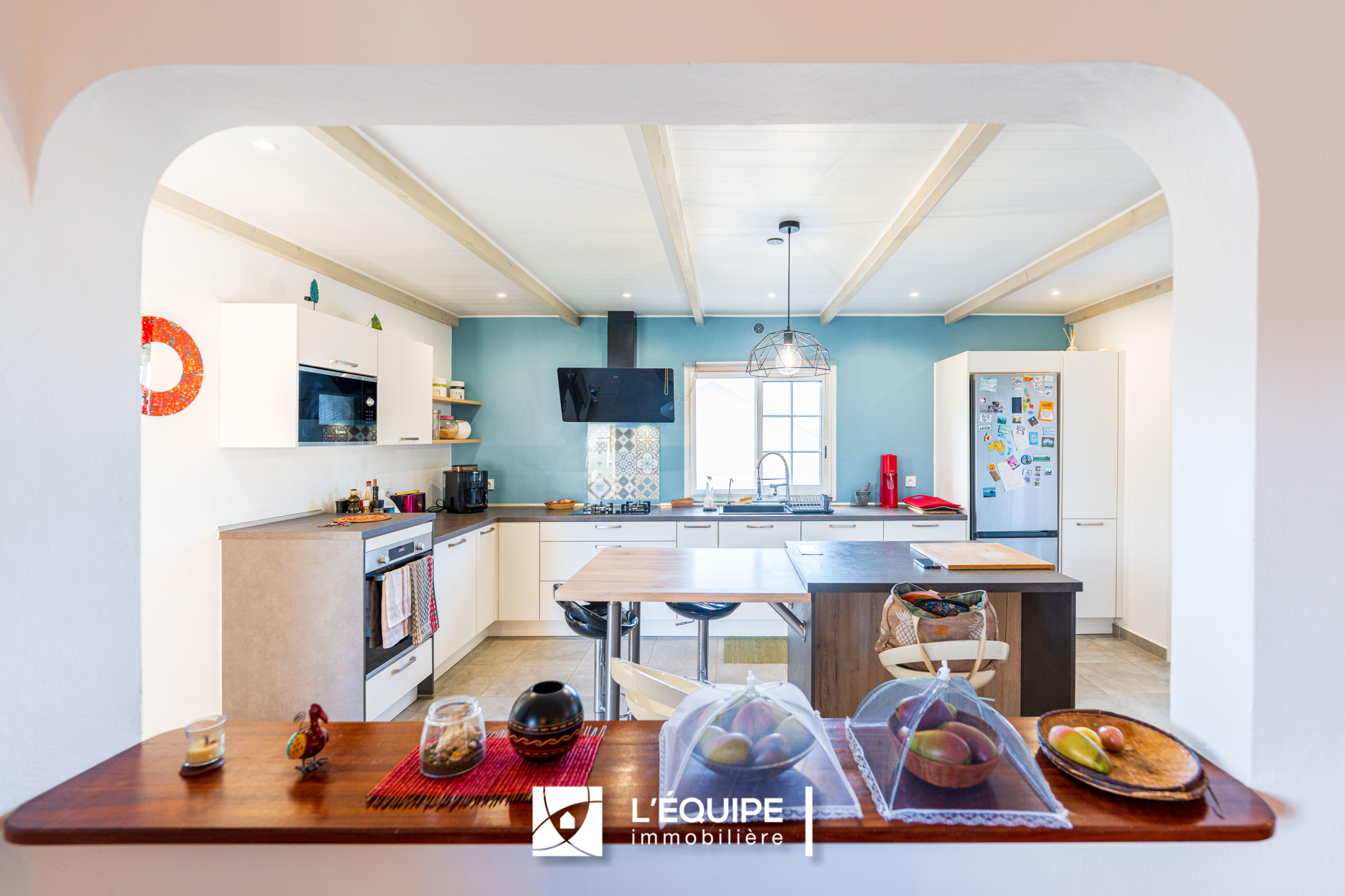 Une cuisine, entièrement équipée donnant sur un séjour de 28 m2, bénéficiant d'une hauteur sous plafond de 5m.