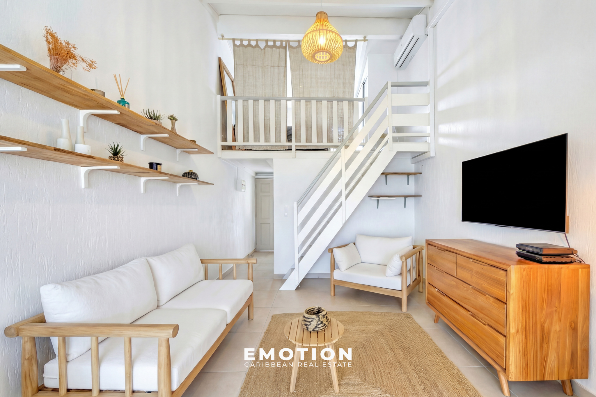 Le bien se compose : d'un séjour lumineux et traversant, avec une cuisine aménagée et équipée, d'une salle d'eau avec WC, ainsi que d'une chambre en mezzanine. L'ensemble de l'appartement, entièrement refait à neuf, est climatisé.