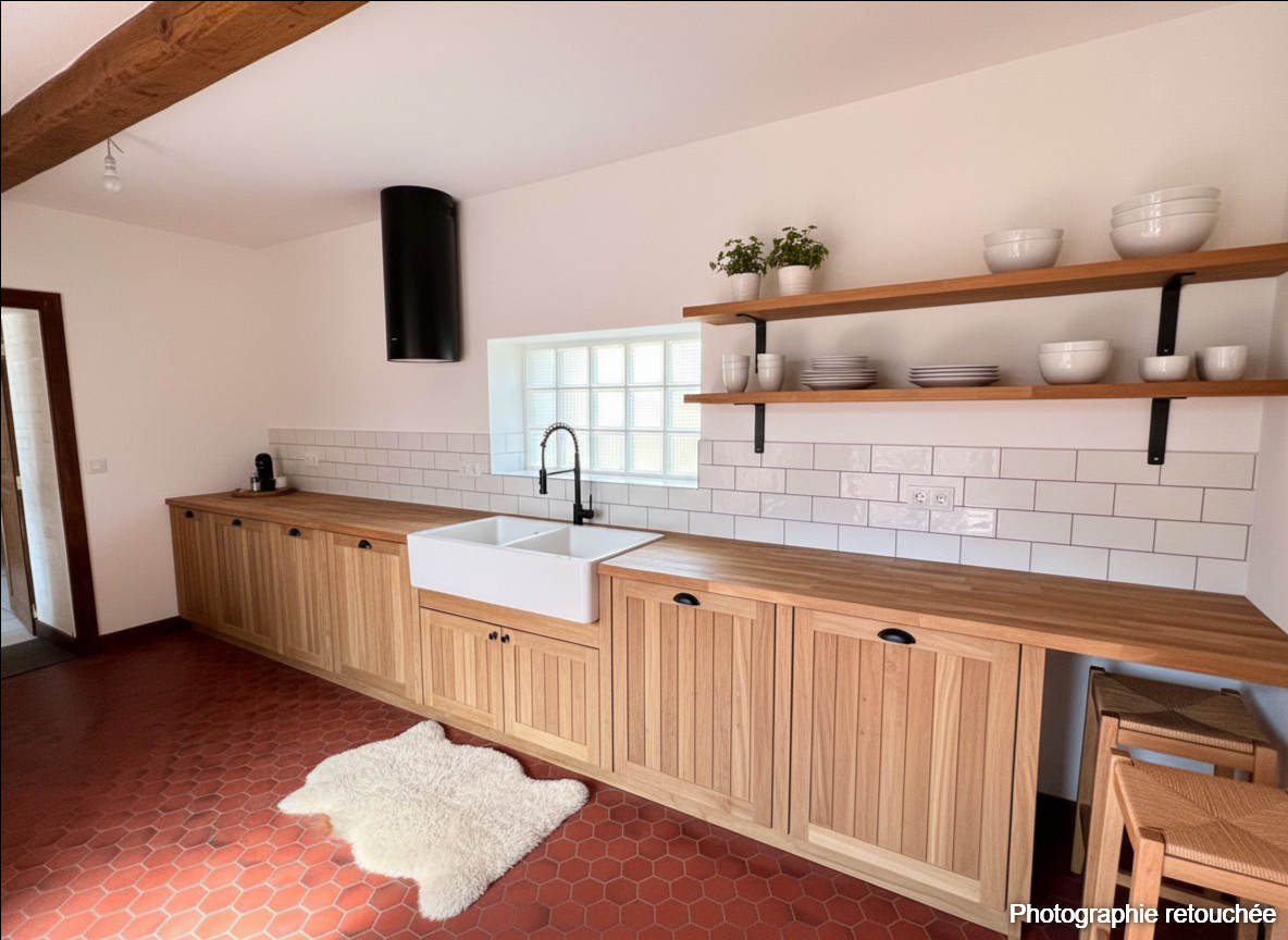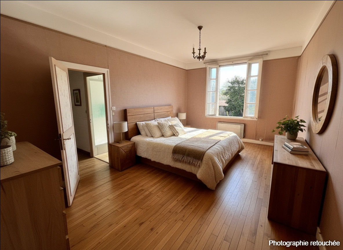 À l'étage : deux chambres avec parquet massif vitrifié, et une salle d'eau avec WC.