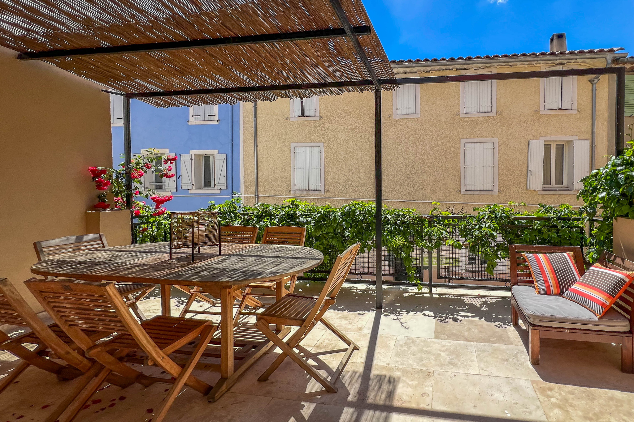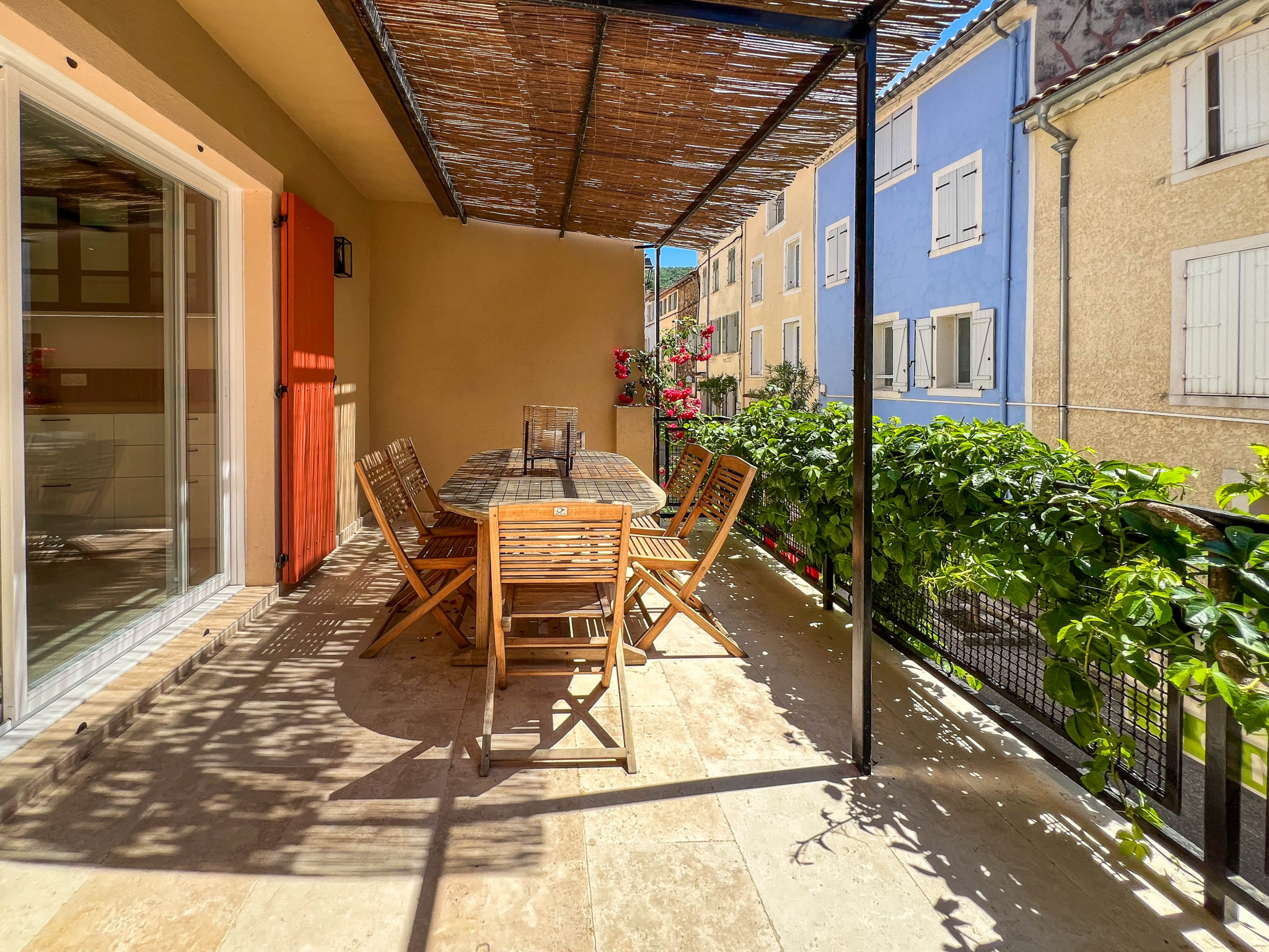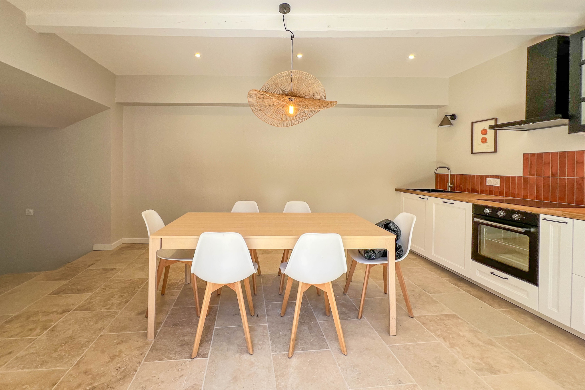 Collobrières, maison de 160 m2 comprenant un vaste séjour avec cuisine orientés sud est, une buanderie, quatre chambres, deux salles d'eau, deux wc, deux terrasses et un garage double de 35 m2. Au calme, l'ensemble est rénové avec élégance par un architecte d'intérieur et dispose du double vitrage et de la climatisation. Pour les amateurs de randonnée (de champignons et de châtaignes), la maison au coeur des Maures est idéale pour des vacances en famille.