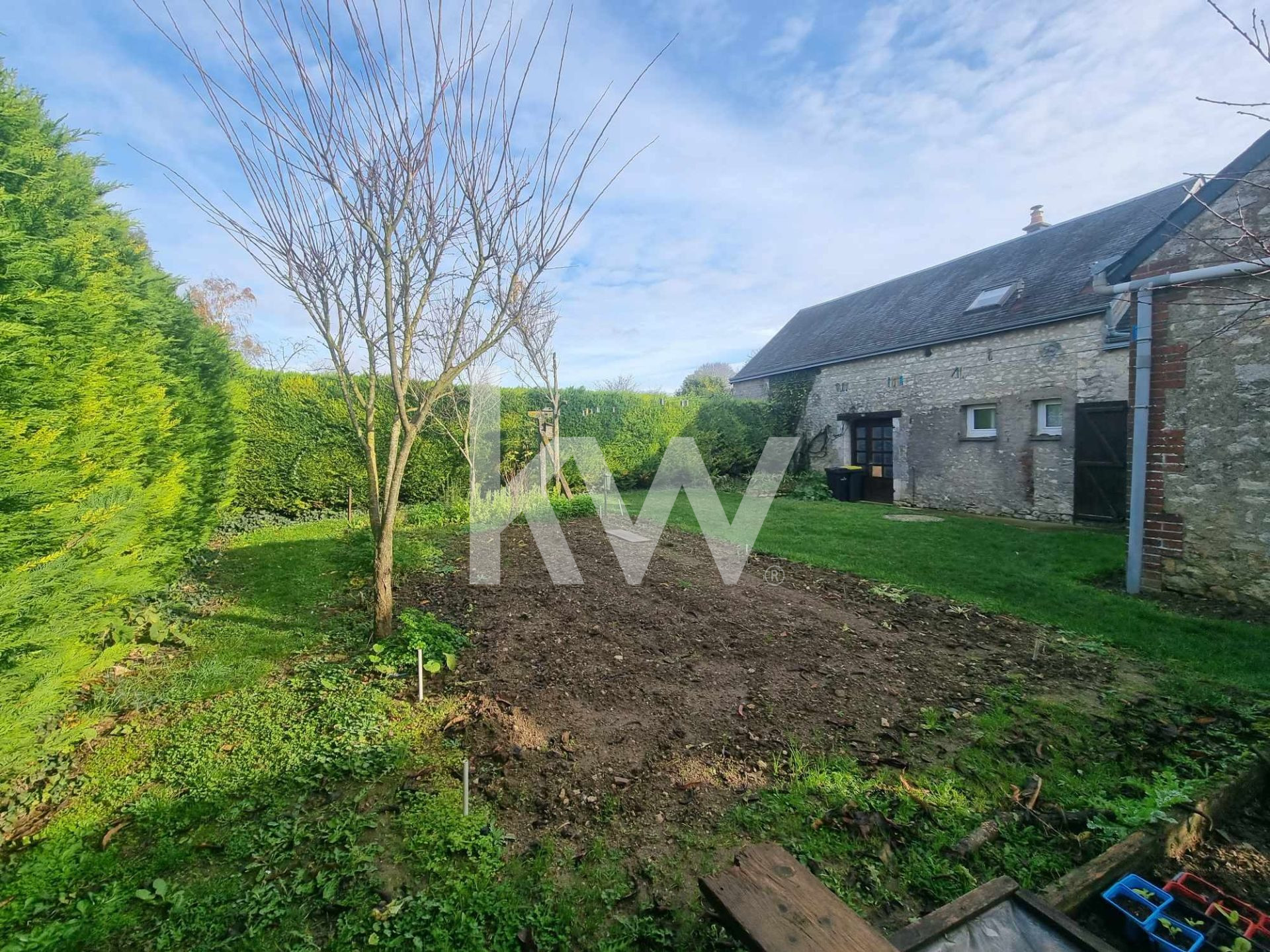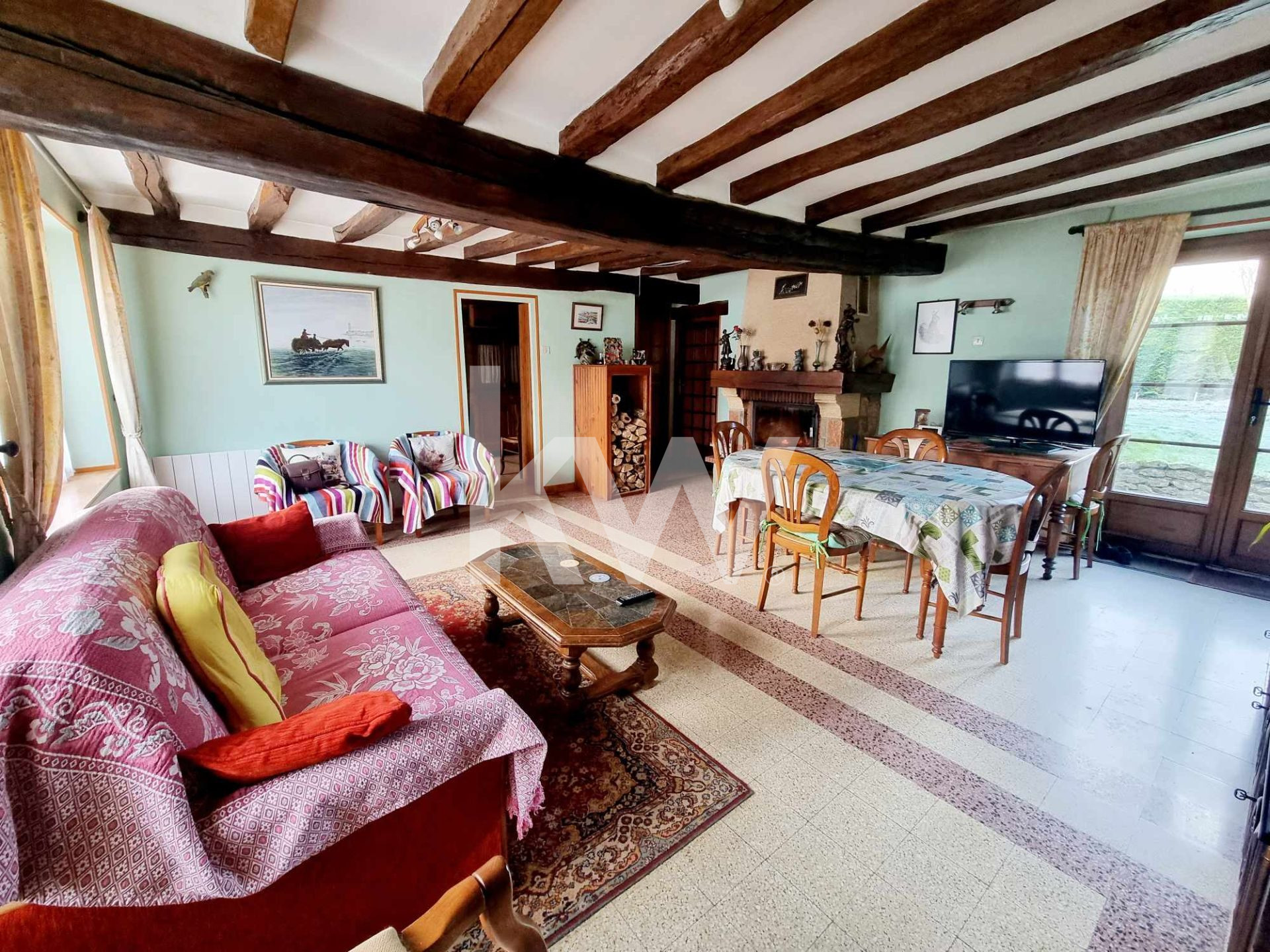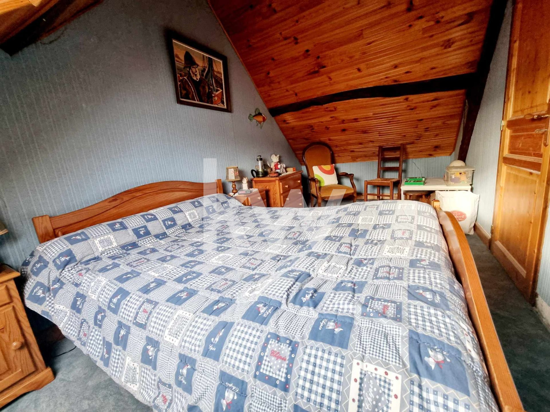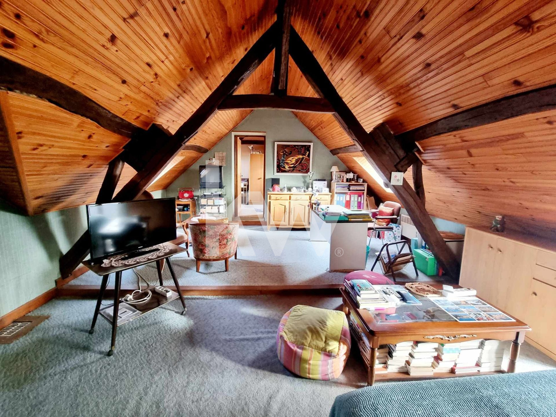 Cette maison dispose de 3 chambres, un grand salon séjour avec cheminée, une cuisine séparée, équipée et aménagée, d'une salle d'eau, une grand pièce de vie à l'étage, d'un grenier aménagé en bureau ( la hauteur du bureau est en grande partie inférieure a 1m80).