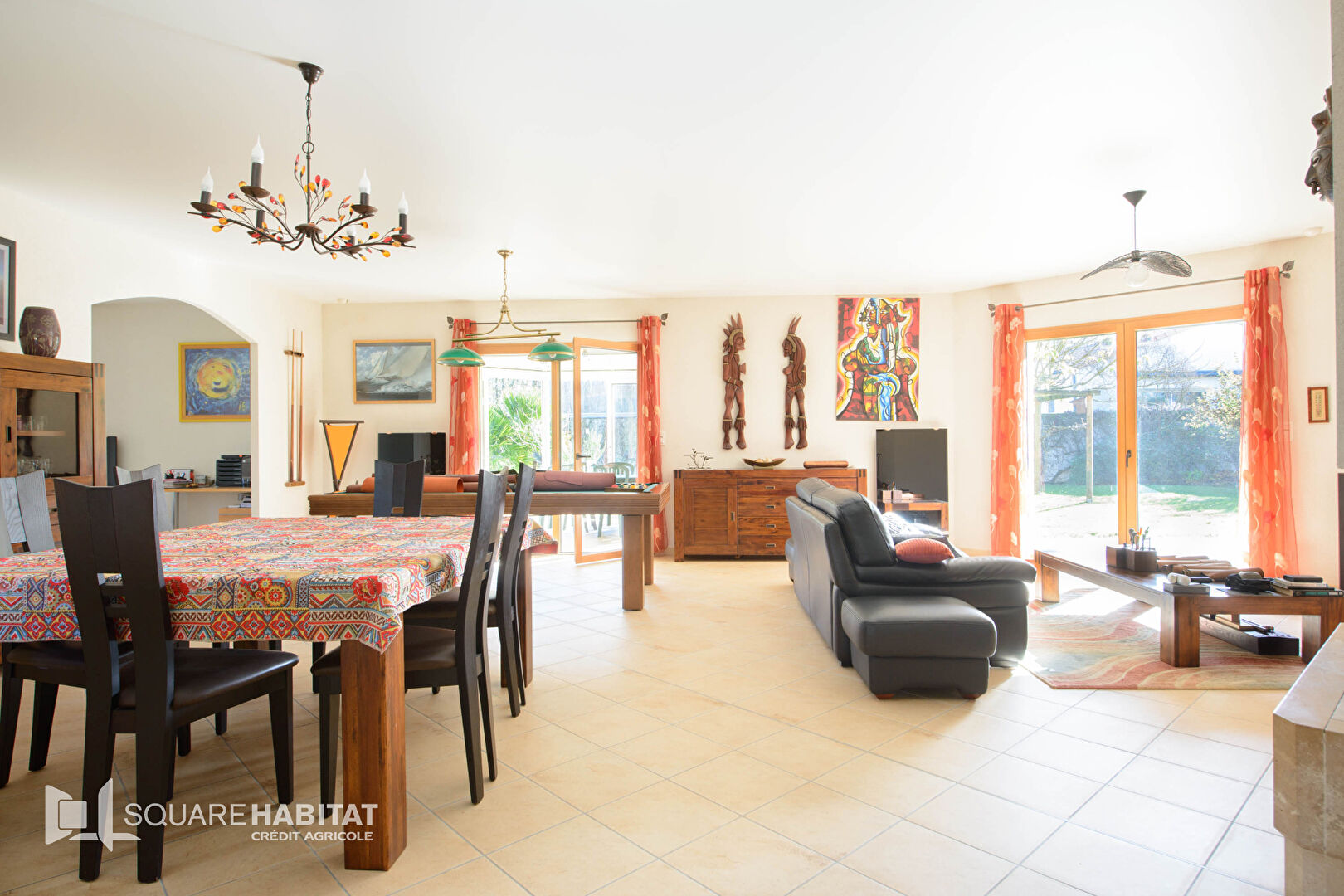 Très belle maison de plain pied de 2006, pour 136m² habitables, comprenant pièce de vie avec cuisine ouverte de 69m², 2 grandes chambres (14.47 et 15.48m²), salle d'eau, wc, lingerie, véranda, garage attenant de 37m².