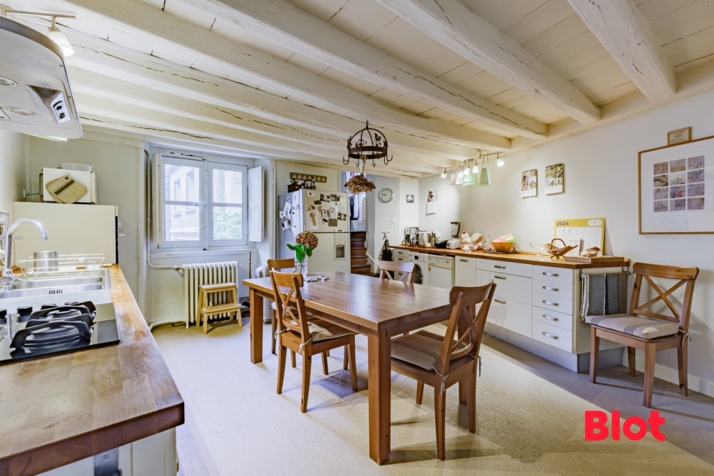 Côté cour, la grande salle à manger est prolongée par une cuisine également tournée vers la cour, offrant un cadre paisible pour les repas, dans une atmosphère accueillante.